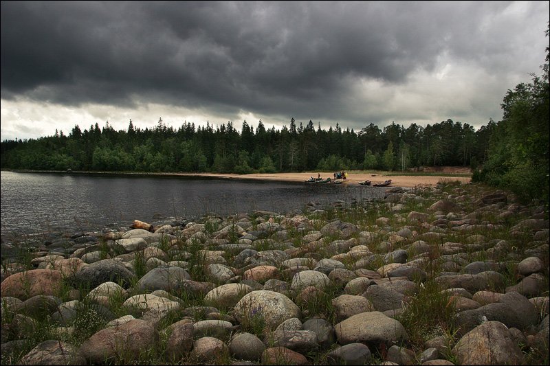 берег, береза, волна, дерево, ель, камень, коса, ладога, ладожское, лес, лодка, небо, облако, озеро, песок, поход, привал, путешественник, сосна, турист, Дмитрий Шамин