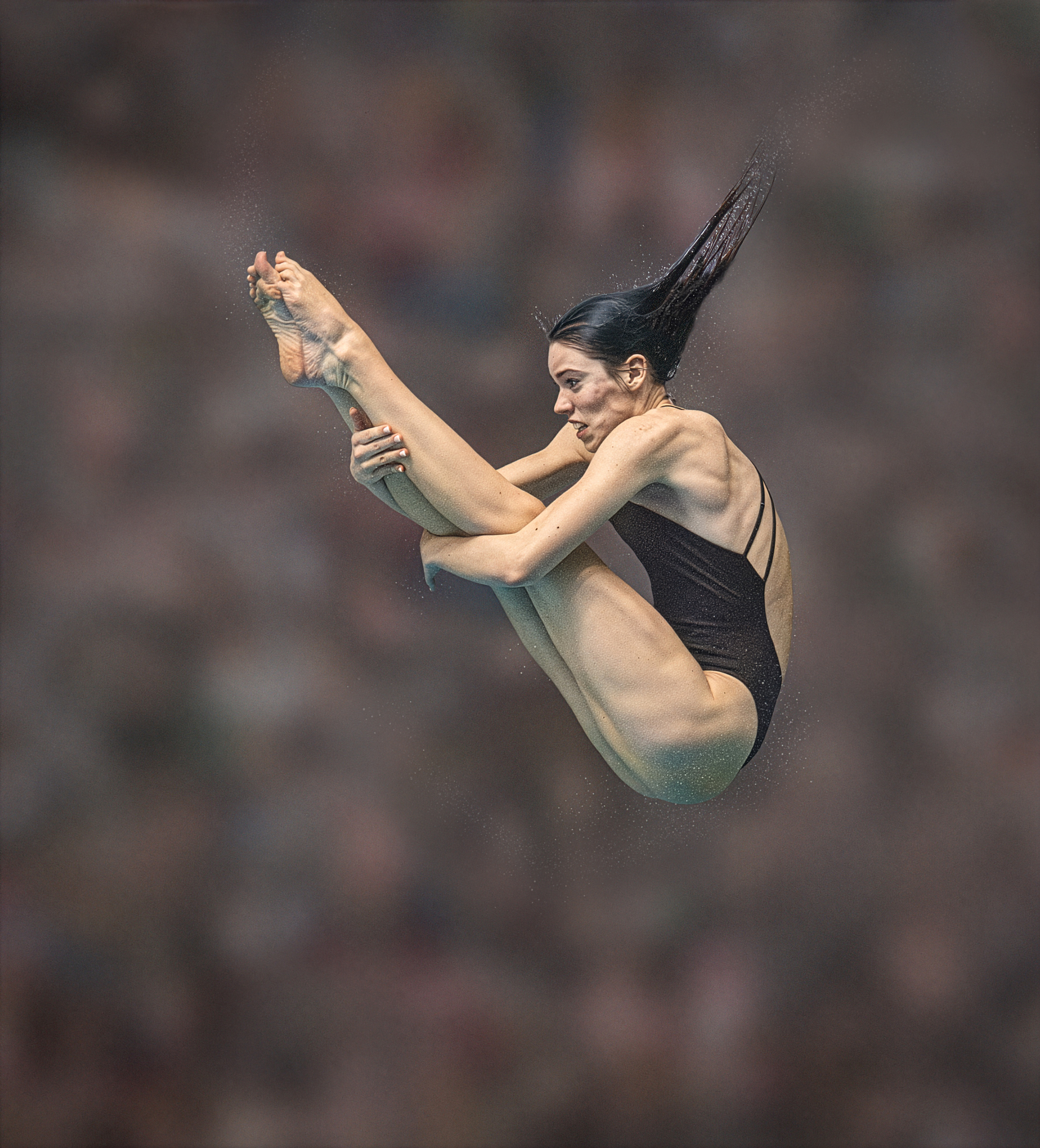 Фотография Eddie Leach запечатлела мгновение, когда спортсменка достигает вершины прыжка в воду — тело сжато в идеальную позу, волосы вздымаются вверх, как будто подхваченные ветром. Кадр передаёт не только техническое совершенство, но и внутреннюю силу, концентрацию и грацию. На фоне размытых тонов акцент делается на чистоте линий и динамике. Это не просто спорт — это искусство в движении, застывшее в кадре.