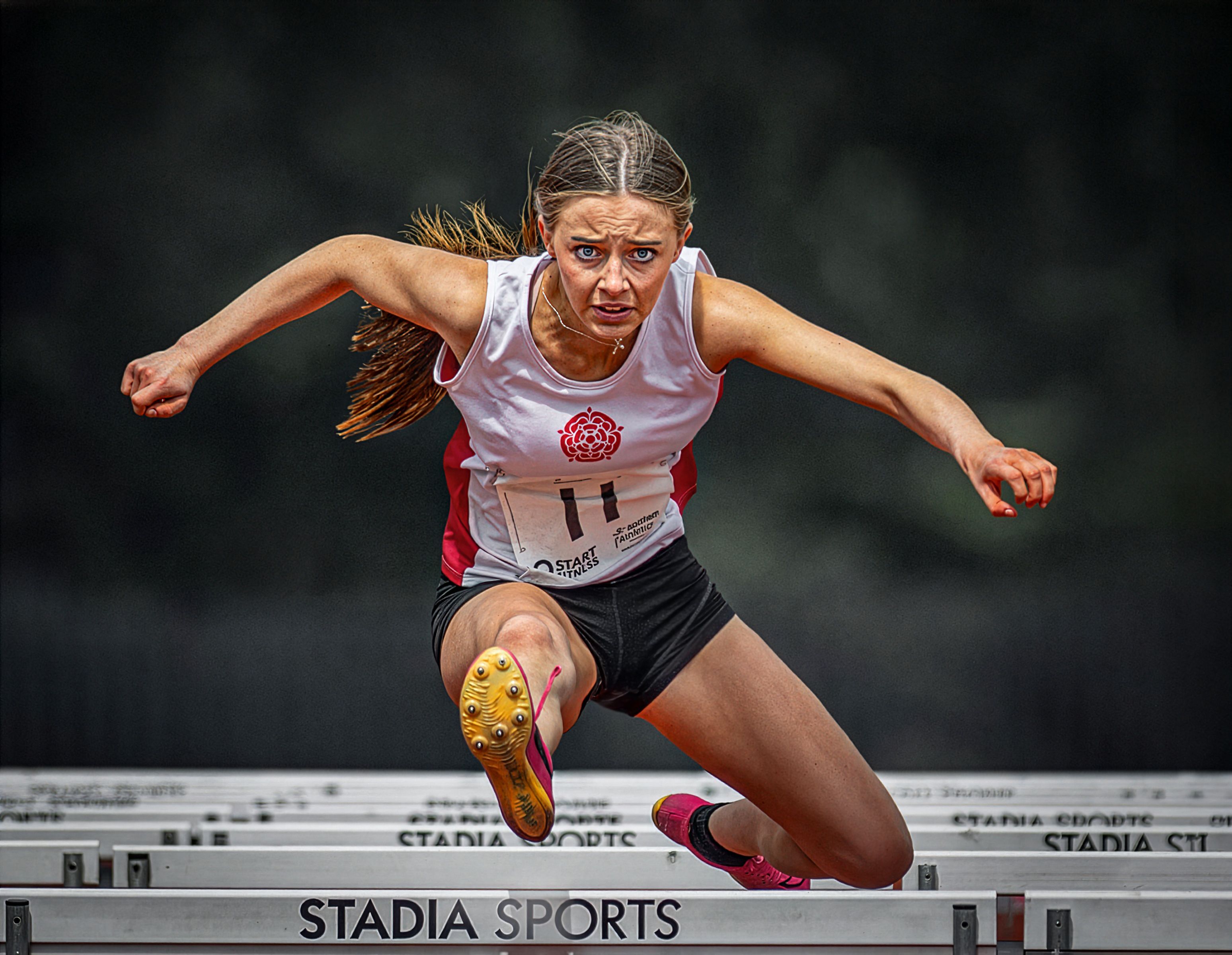 Фотография захватывает кульминационный момент — спортсменка в прыжке над барьером, её взгляд сосредоточен на цели. Каждая мышца напряжена, тело в идеальной координации. На переднем плане — логотип "STADIA SPORTS", подчёркивающий профессиональный уровень соревнований. Снимок передаёт динамику, силу и эмоциональное напряжение, присущее атлетическим состязаниям.