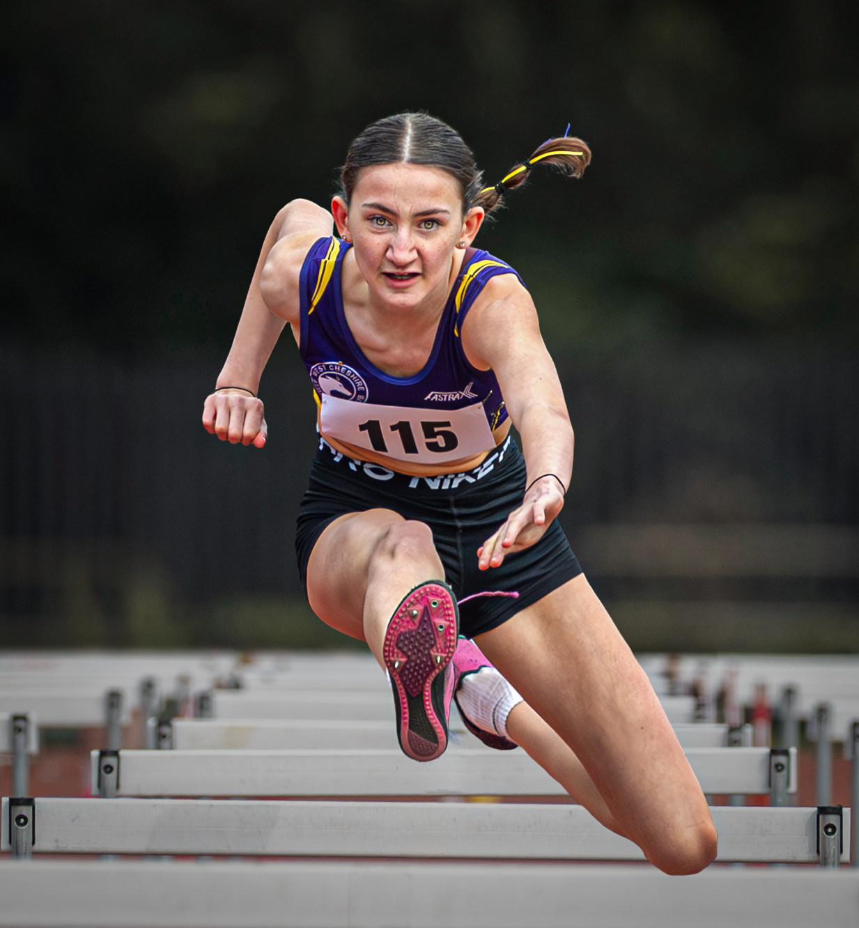 В кадре — яркий срез атлетического напряжения: Freya Whitaker, в фиолетовом топе и чёрных шортах, в полете над барьером. Её тело наклонено вперёд, нога подтянута, взгляд — на финиш. Фотография передаёт скорость, точность и силу. Это не просто забег — это борьба с временем и гравитацией. Каждый миллиметр — шаг к победе.