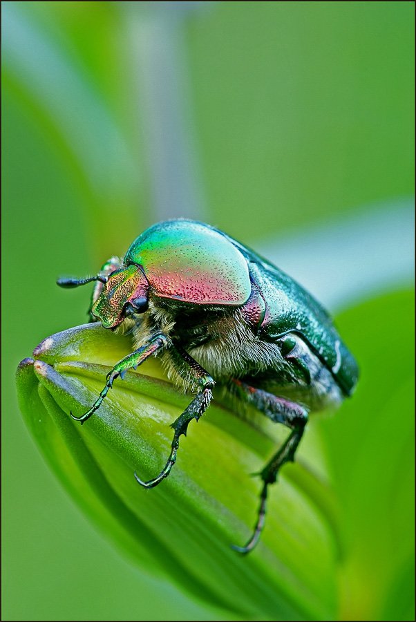 Да сидит он на лилии. А смирно сидит так как снято вечером и жук уже собрался спать :)