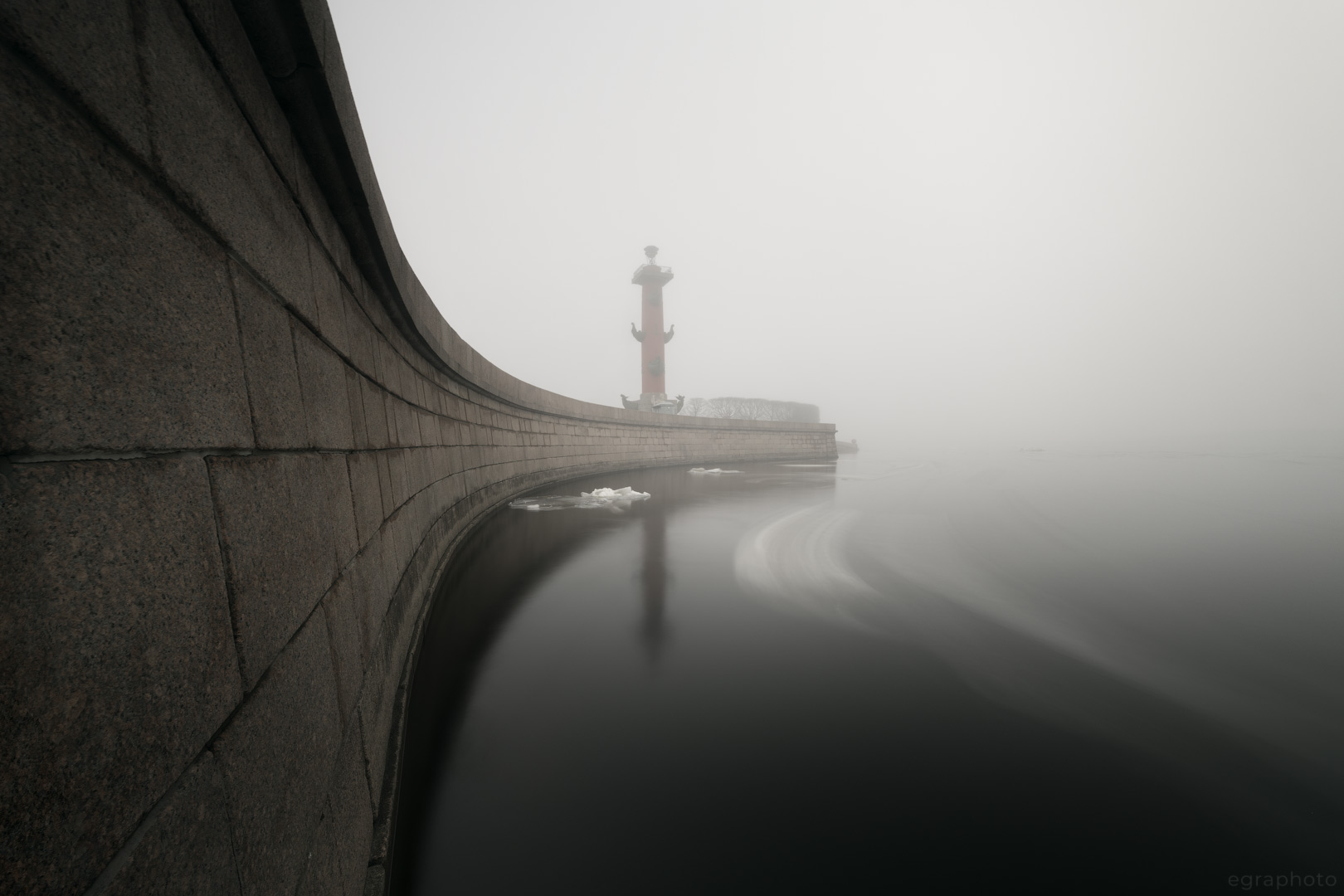 Вы уловили суть Петербурга в тумане — строгая линия набережной, отражение колонны в воде, лёд на краю — всё это создаёт ощущение глубины и тишины. Композиция сбалансирована, а атмосфера — насыщенная, без лишнего шума.