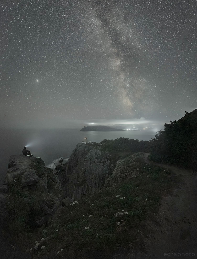 Снимок очень атмосферный — звёздное небо над мысом Балюзек передаёт ощущение масштаба и спокойствия. Маяк вдали добавляет точку опоры, а силуэт человека с фонарём создаёт нужный акцент на одиночестве и созерцании.