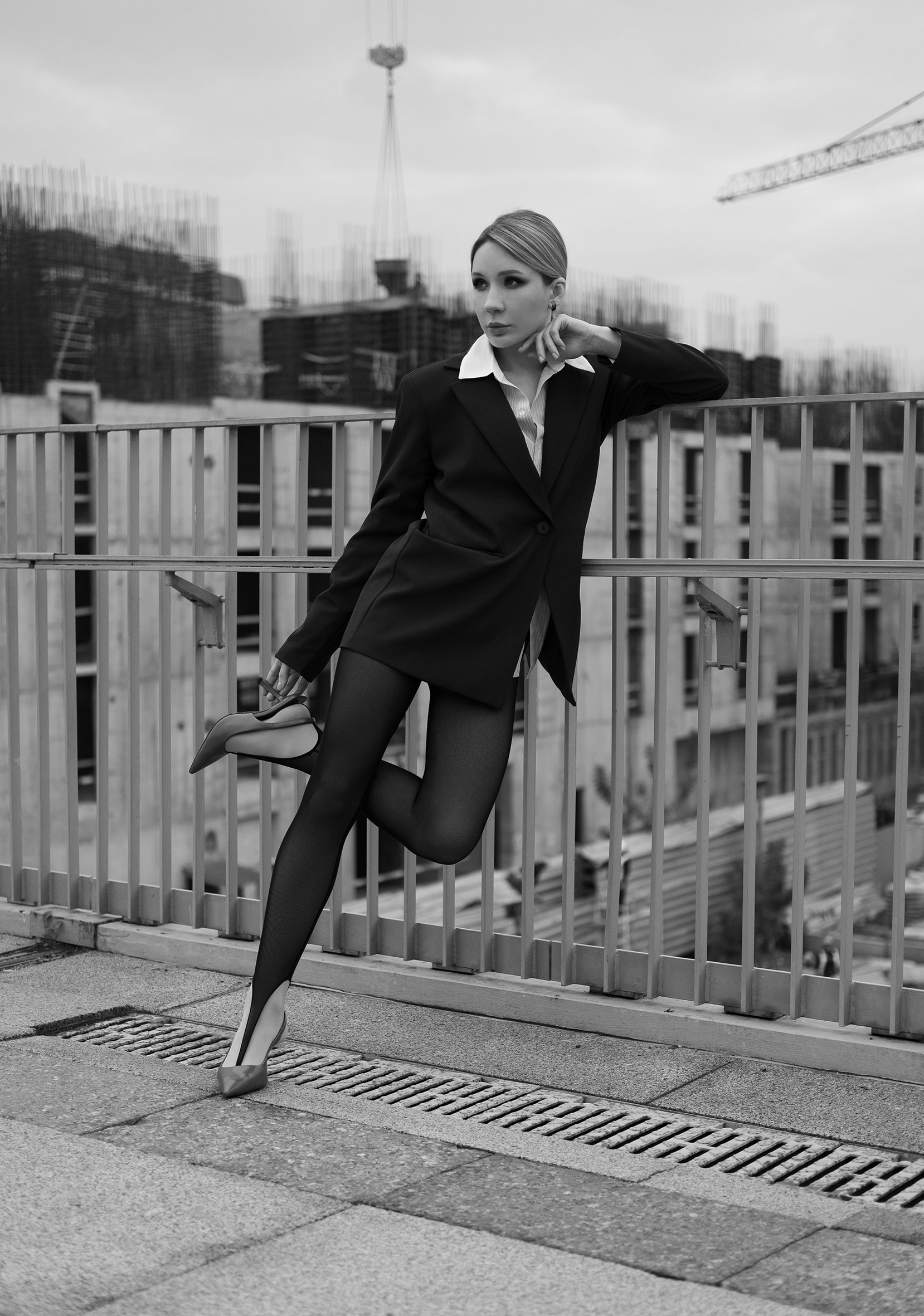 Сильные стороны: чёткая композиция, выразительная поза модели, контраст между чёрным костюмом и светлым фоном, удачное использование городского пространства как фона. Глубина резкости и светотень подчёркивают силуэт. 🖤