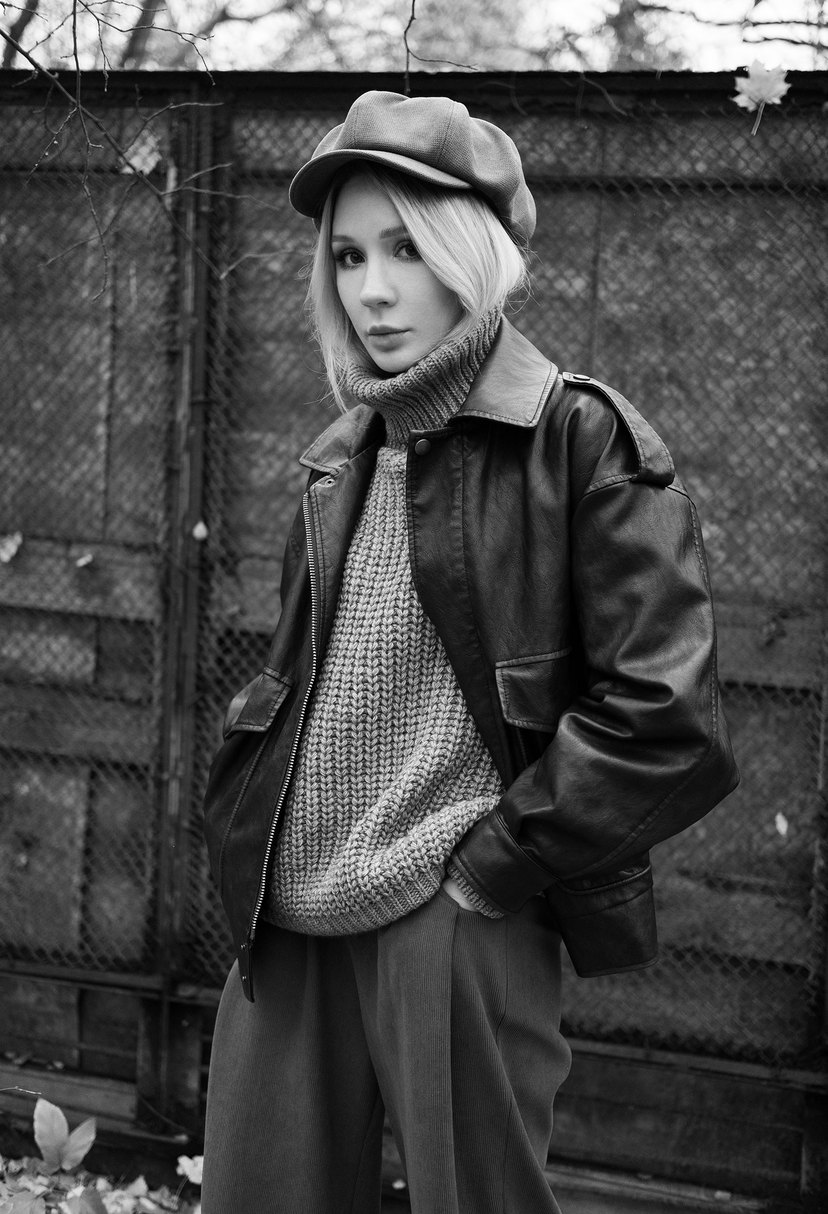 Чёрно-белый образ — чёткий, сдержанно стильный. Вы снова уловили характерный свет и тени, что создаёт узнаваемый настрой — модель в кадре как будто вырезана из городской тишины.