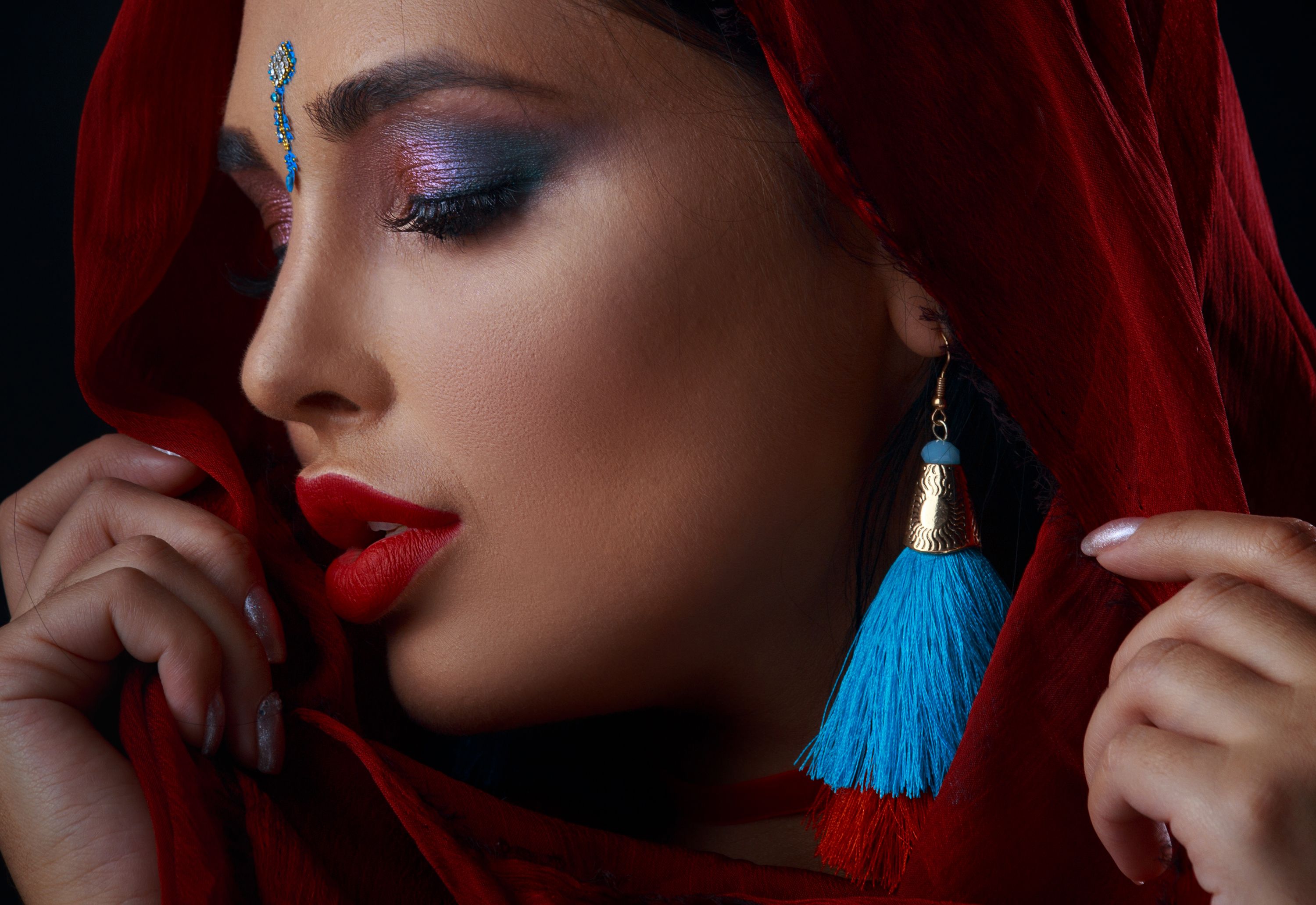 В тени и свете — профиль женщины, чьи черты скрыты за шелковым шарфом, словно в древнем ритуале. Бирюзовые серьги-кисточки контрастируют с глубоким красным, а макияж с фиолетовыми и синими оттенками придаёт взгляду магическую силу. Фотограф Gary запечатлел момент, где красота и тайна сливаются в едином образе, напоминающем сцену из восточной сказки. Каждый элемент — от макияжа до позы — говорит о внутреннем огне, скрытом за тканью.