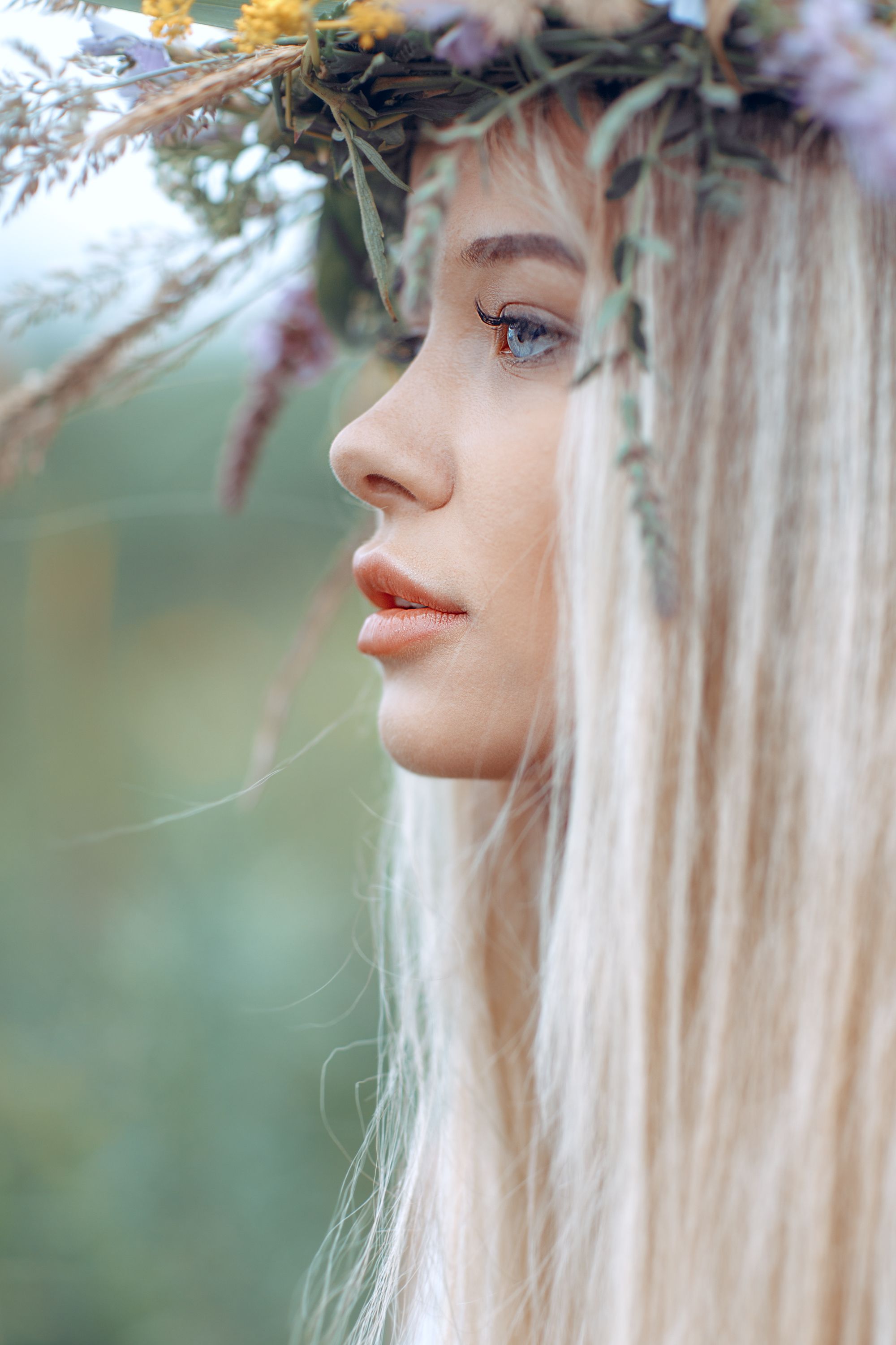 На снимке — портрет девушки в венке из полевых цветов, смотрящей в сторону. Её светлые волосы мягко ложатся на плечи, создавая ощущение легкости и естественности. Фон размыт, что акцентирует внимание на лице и венке. Свет мягкий, как в утреннем лесу. Фотография передаёт спокойствие и связь с природой. Фотограф: Gary.