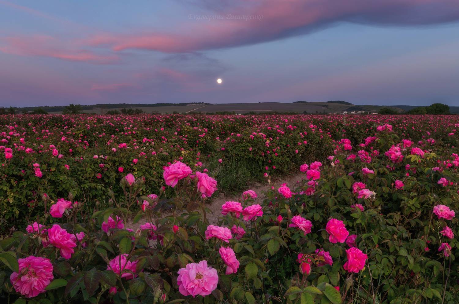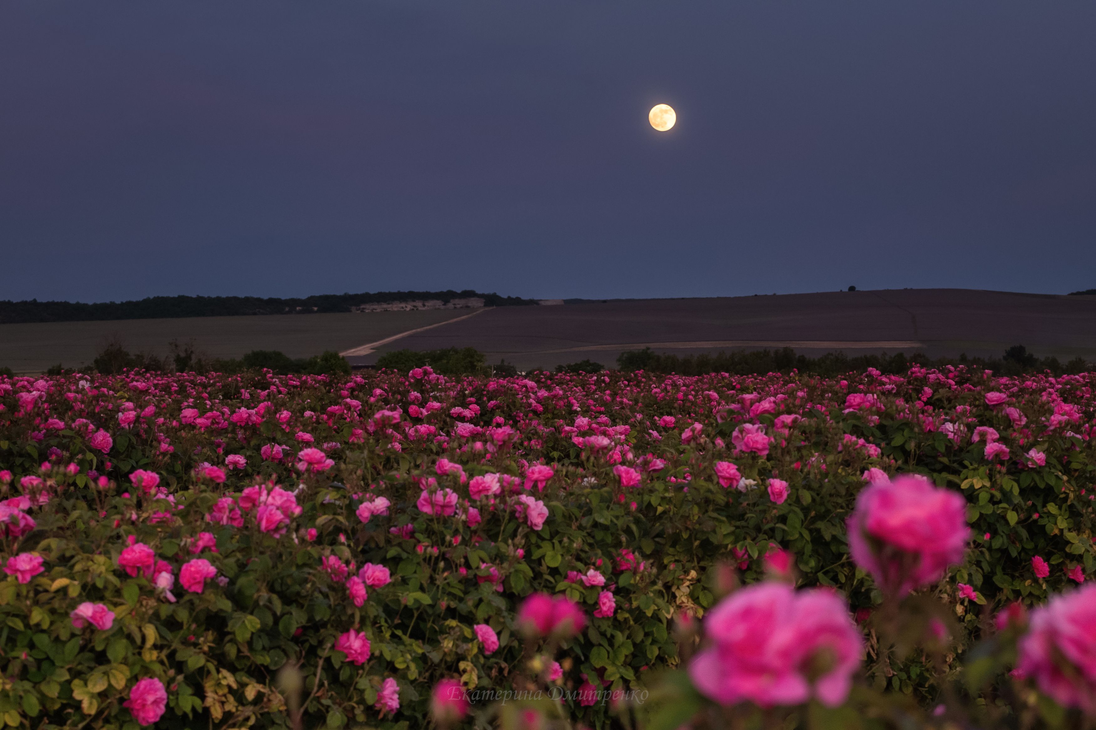 Восход полной луны над розовыми плантациями. с. Тургеневка, Бахчисарайский район Крыма. Конец мая 2024.