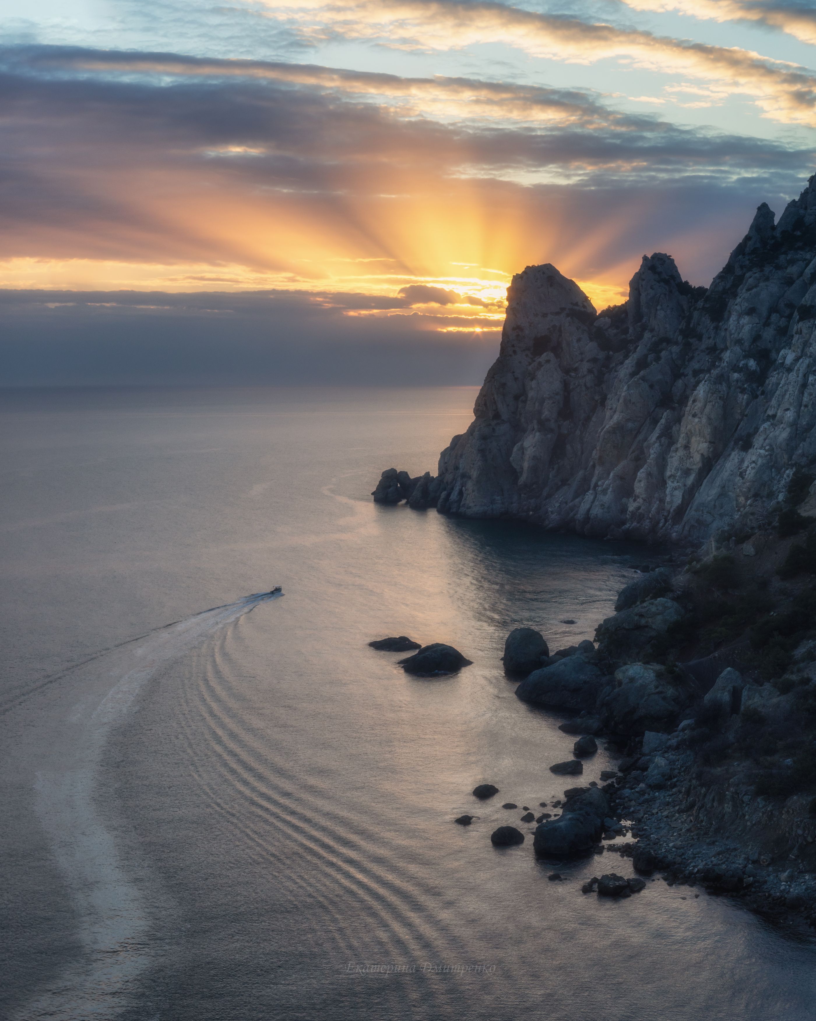 Красиво. Закат над морем, как будто свет прорывается сквозь облака — тёплый, мягкий. Караул-Оба в тени, а вода — будто зеркало, отражает небо. Екатерина хорошо поймала момент.