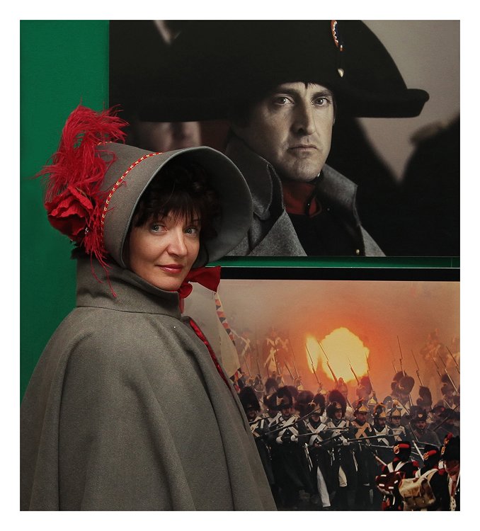 Ирина Полякова /маркитанка, рядовой Московского пехотного полка/ во время посещения фотовыставки в Храме Христа спасителя 7.01.13 года. На фоне - Наполеон ( фотоработы Владимира Вяткина).