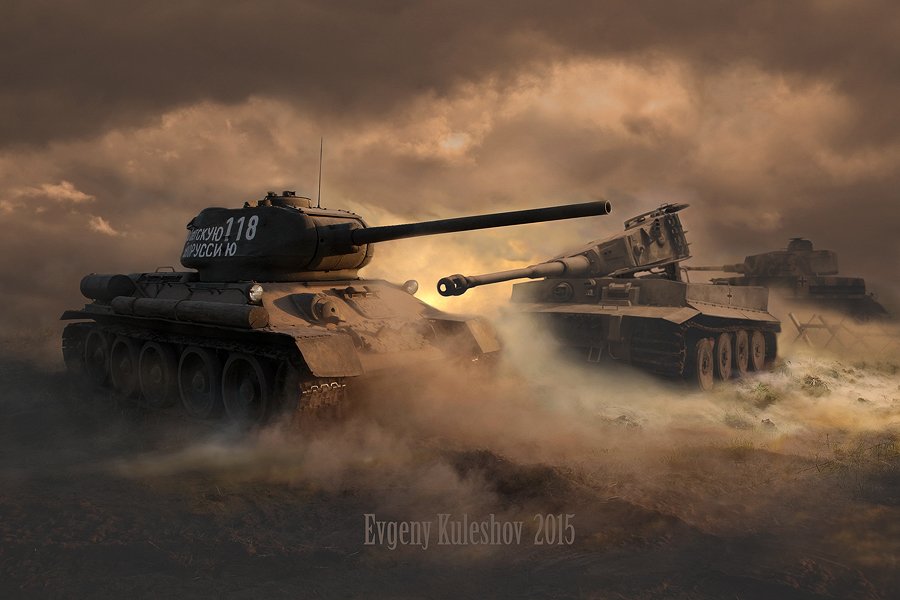 Танковое сражение конца войны. Фоторабота собрана из реально действующих образцов военной техники танка Т-34-85, тяжелого танка немецкой армии "Тигр" Т6, и среднего танка Т4. Съемки с военно-исторических реконструкций 2013-2014 гг.