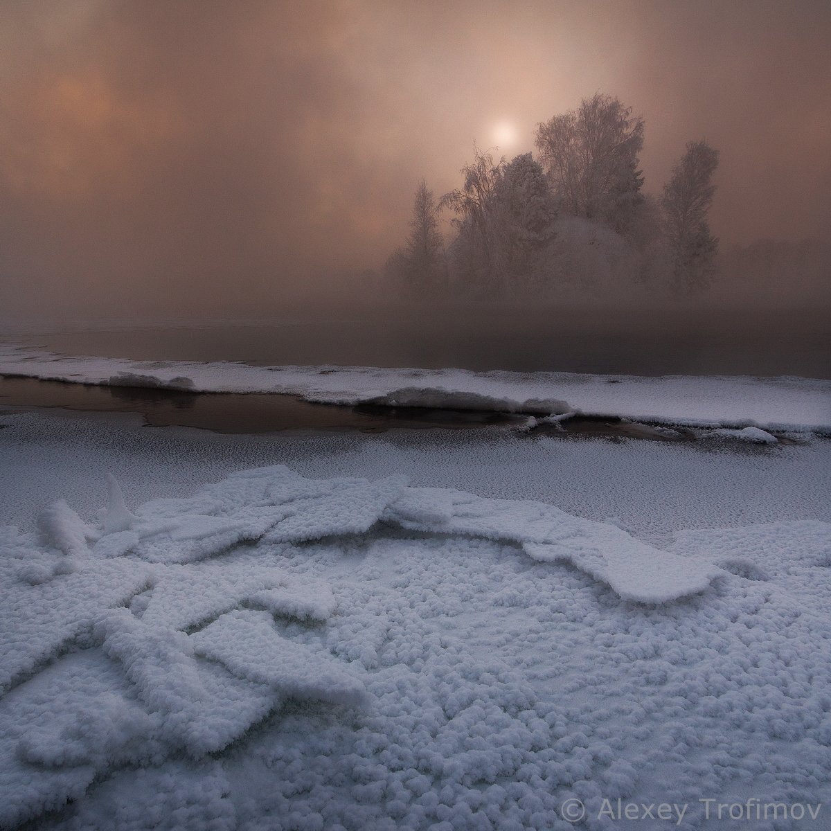 Ангара, Закат, Зима, Лед, Пейзаж, Снег, Туман, Алексей Трофимов