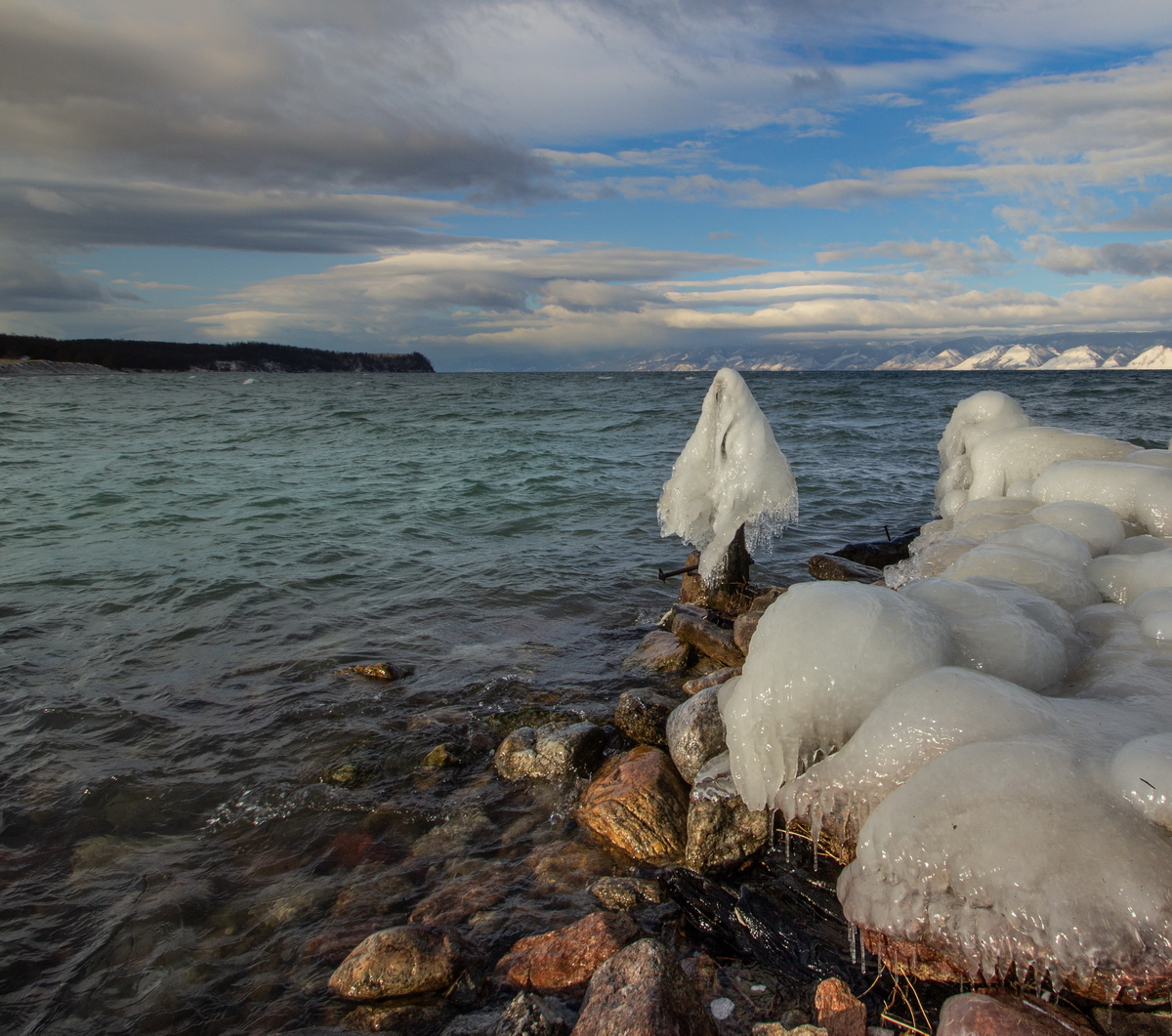 Сокуй — ясно. Шторм и минус — идеальные условия. Лёд рваный, как будто волна застывшая в момент удара. Камни в переднем плане — сухие, но близко к воде — значит, снимок сделан в момент, когда волны не доходят до них, а брызги — да. Видно, что ветер был, но не сильный — иначе бы лёд был гладким. Декабрь — начало зимы, значит, ещё много времени до полного ледостава. Хорошо, что снято до того, как всё застыло полностью — снимок живой, не мёртвый.