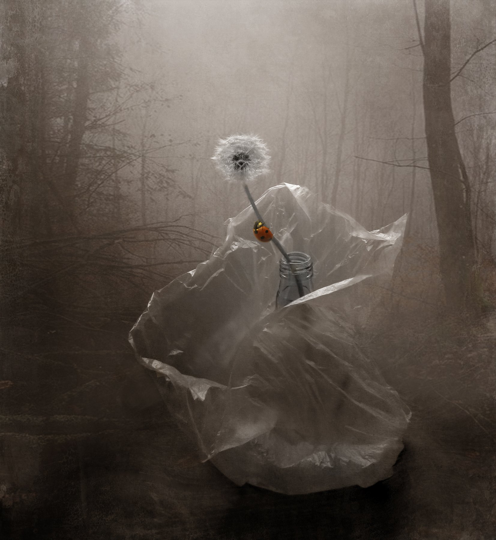 божья коровка, одуванчик, бутылка, пакет, лес, природа, Елена