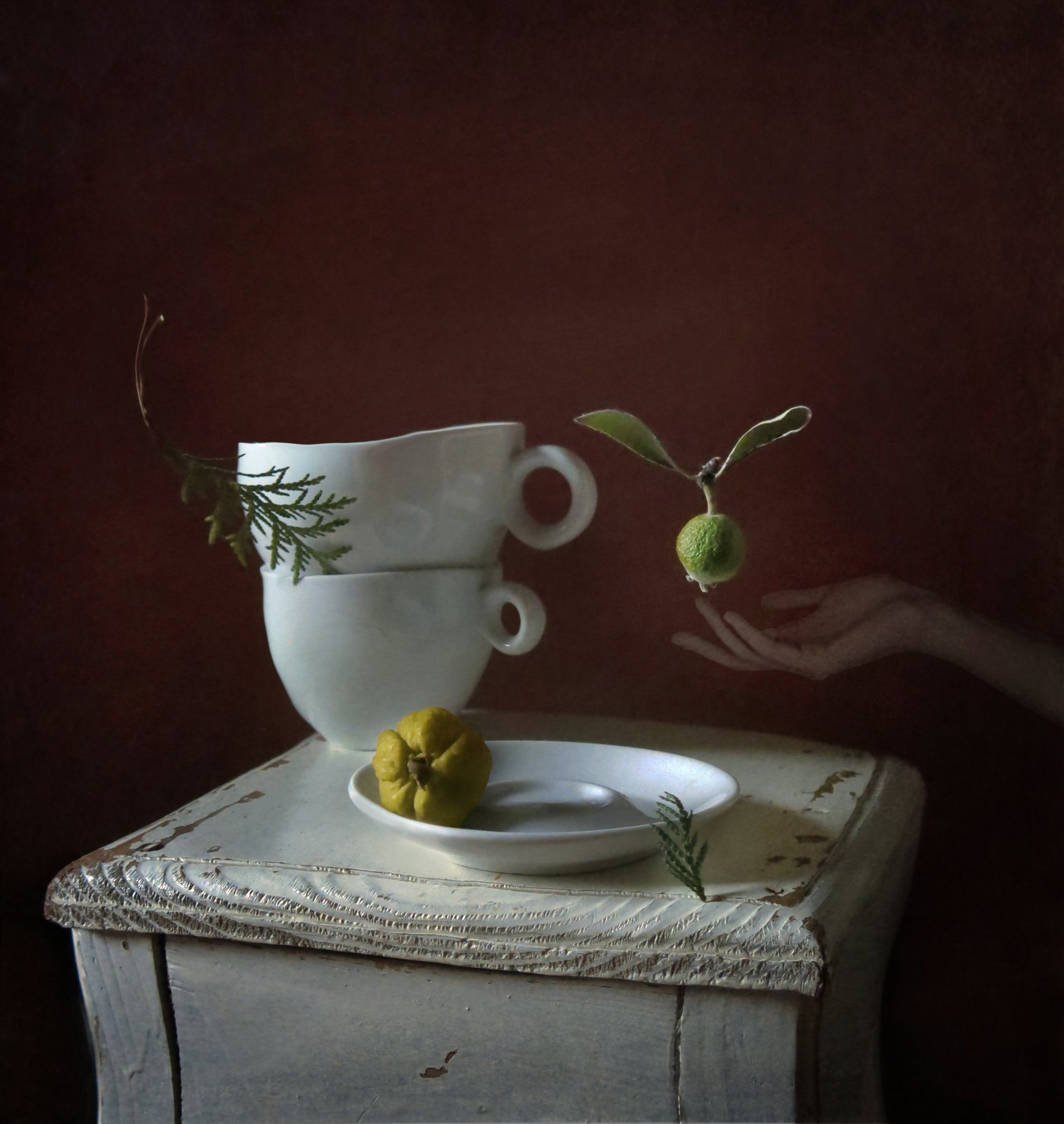 фрукт, посуда, чашка, блюдце, табурет, рука, веточка, невесомость, Елена Лысенко