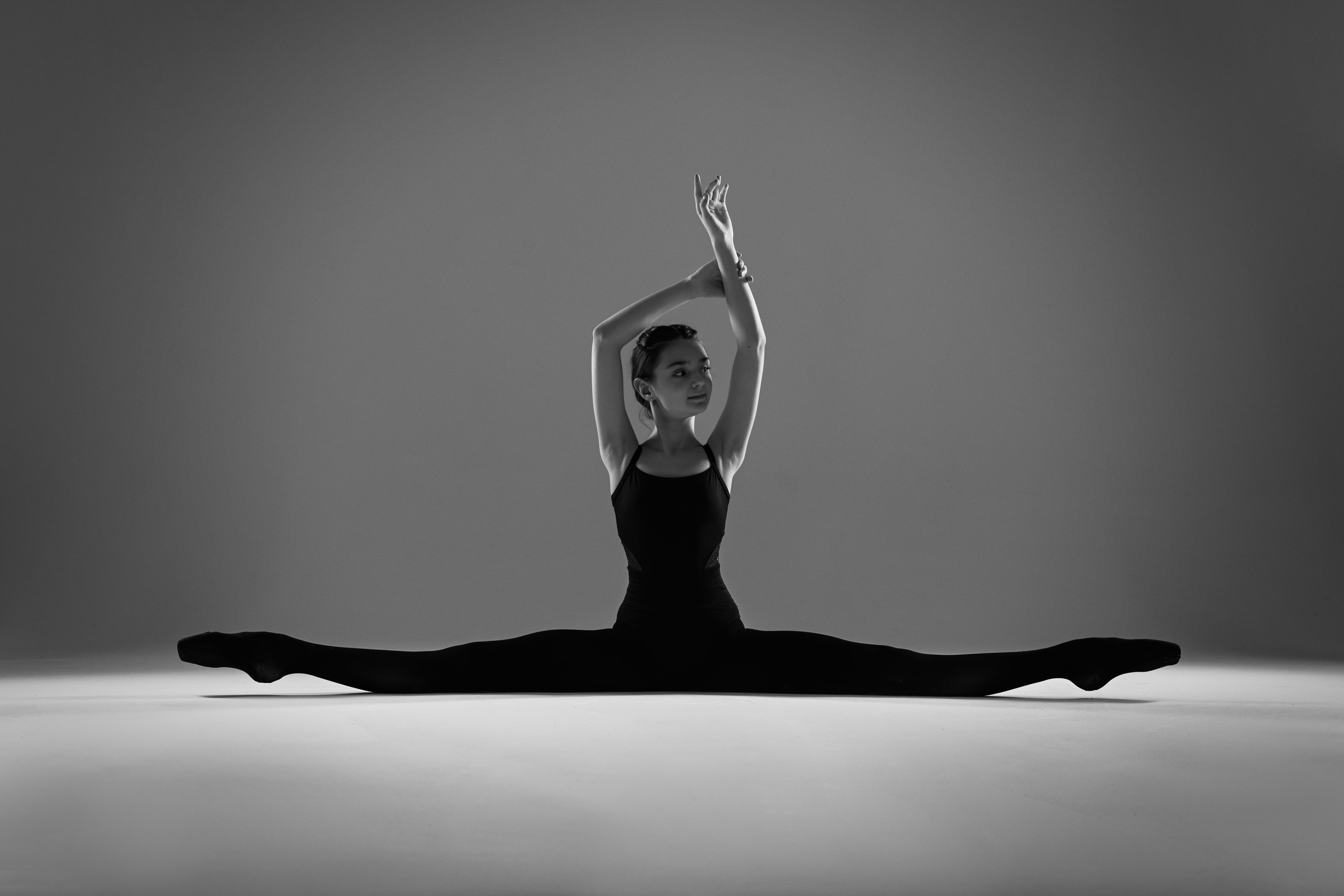 Черно-белый кадр фиксирует момент абсолютной гармонии — балерина в раздельном прыжке, тело вытянуто в линию, руки сведены в изящный жест. Минималистичный фон и мягкий свет создают атмосферу сосредоточенности и внутренней силы. Фотография передает не только технику, но и эмоциональную глубину танца. Работа Елены Евдокимовой — это поэзия движения, застывшая в кадре.