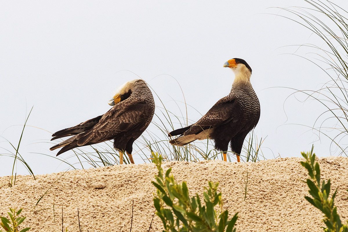 Птицы сидели метрах в 20 от меня, на соседней дюне. Самец подходит к самке, они делают вместе круг в воздухе, и приземляются ровно туда, откуда взлетели. Потом происходит спаривание, а после него оба по очереди закидывают головы на спины издавая подобие песни, если так можно назвать их скрипучее карканье.