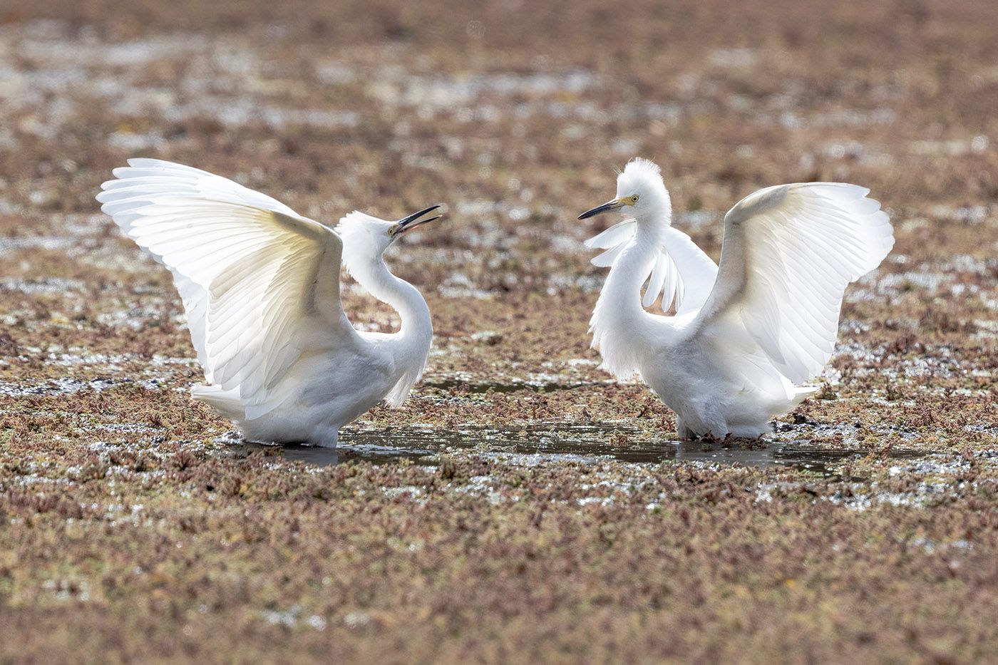 Эта серия - история неудачной охоты. Птицы любят подсматривать друг за другом во время охоты - а вдруг что перепадет на халяву. Американские белоснежные цапли тут не исключение. Одна поймала мелкую рыбешку, вторая подлетела с надеждой. Но первая от неожиданности рыбку выронила ( если присмотреться она видна на первом фото), ну а потом они просто поругались и обе остались не солоно хлебавши.
