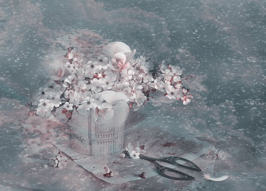 сон зима весна  абрикосовые  цветы старинные ножницы метель, Eлена Шовкопляс