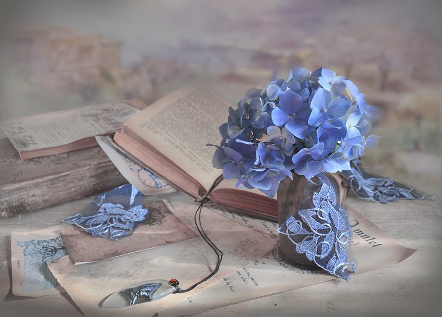 натюрморт книги букет утро винтаж ретро голубая гортензия письма амулет, Eлена Шовкопляс