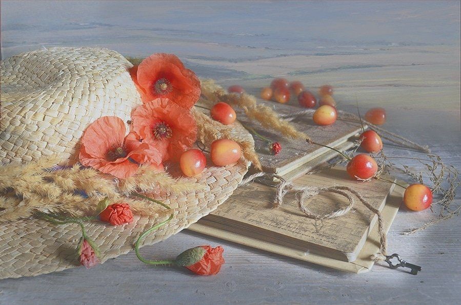 Лето соломенная шляпа Черешни натюрморт свежесть маки книги радость любовь, Eлена Шовкопляс
