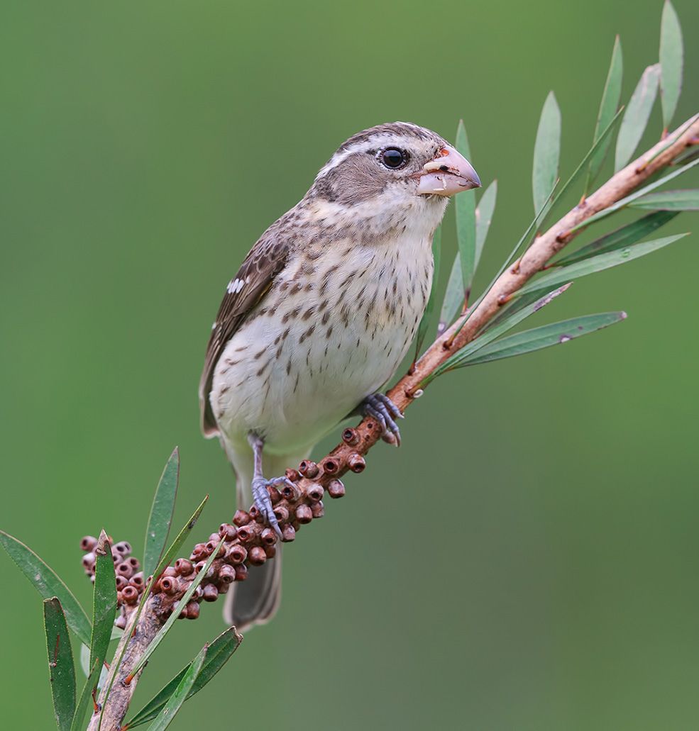 Очень большой и сильный клюв белёсого цвета. Размеры взрослой птицы 20см.