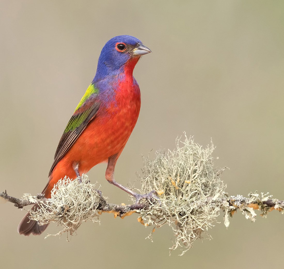 Teхас. Расписной овсянковый кардинал - Painted bunting - певчая птица семейства кардиналовых. Это крайне робкая и таинственная птица, поющих самцов наблюдать легче. Птицы питаются насекомыми и их личинками.