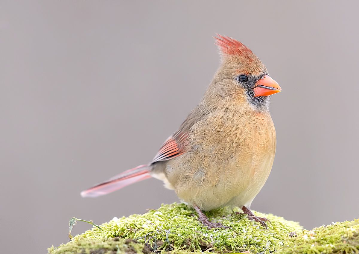 В окраске самки преобладают серовато-коричневые тона, с красноватыми перьями на крыльях, груди и хохолке, с менее выраженной «маской» чем у самца.
