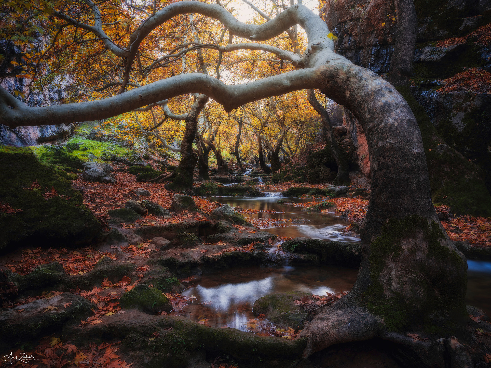 Strong use of light and color in the autumn forest—golden foliage contrasts well with mossy rocks and flowing water. The long exposures smooth the streams effectively, adding a sense of calm movement through the landscape.