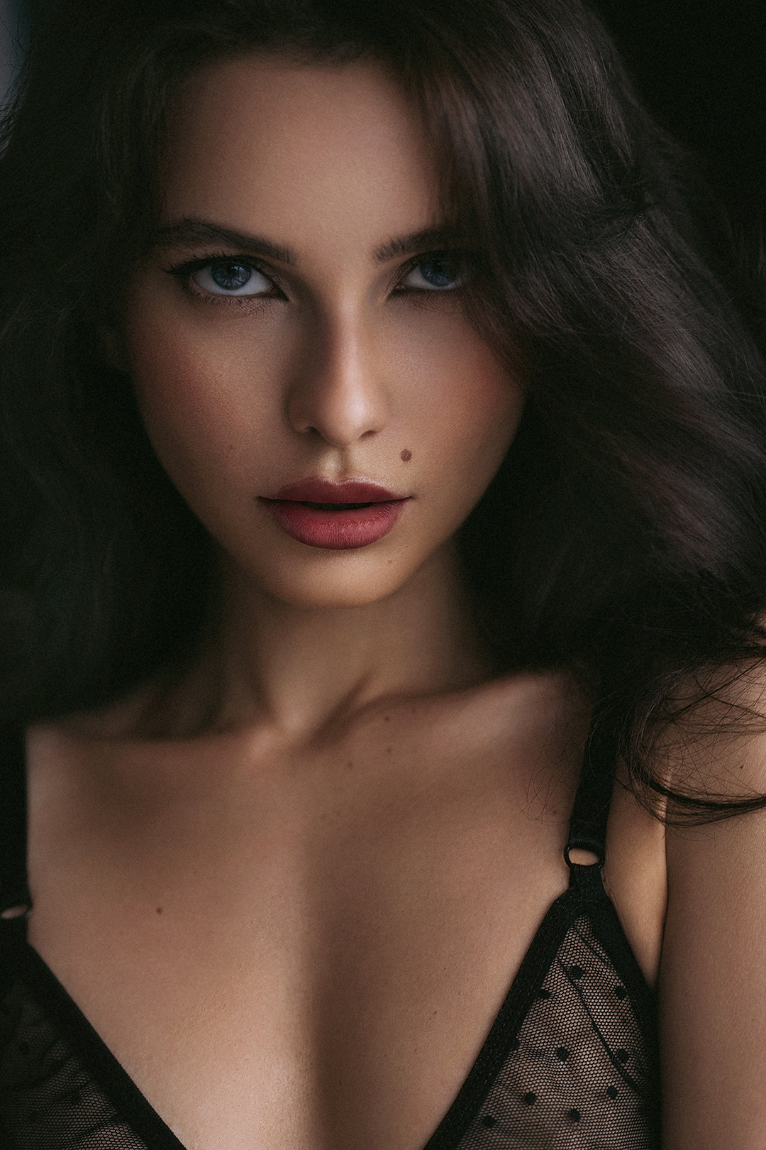 В этом кадре запечатлен момент интимной близости с собственным образом. Модель смотрит прямо в объектив, создавая эффект присутствия и доверия. Мягкое освещение акцентирует внимание на чертах лица и текстуре одежды, подчеркивая элегантность и загадочность момента.