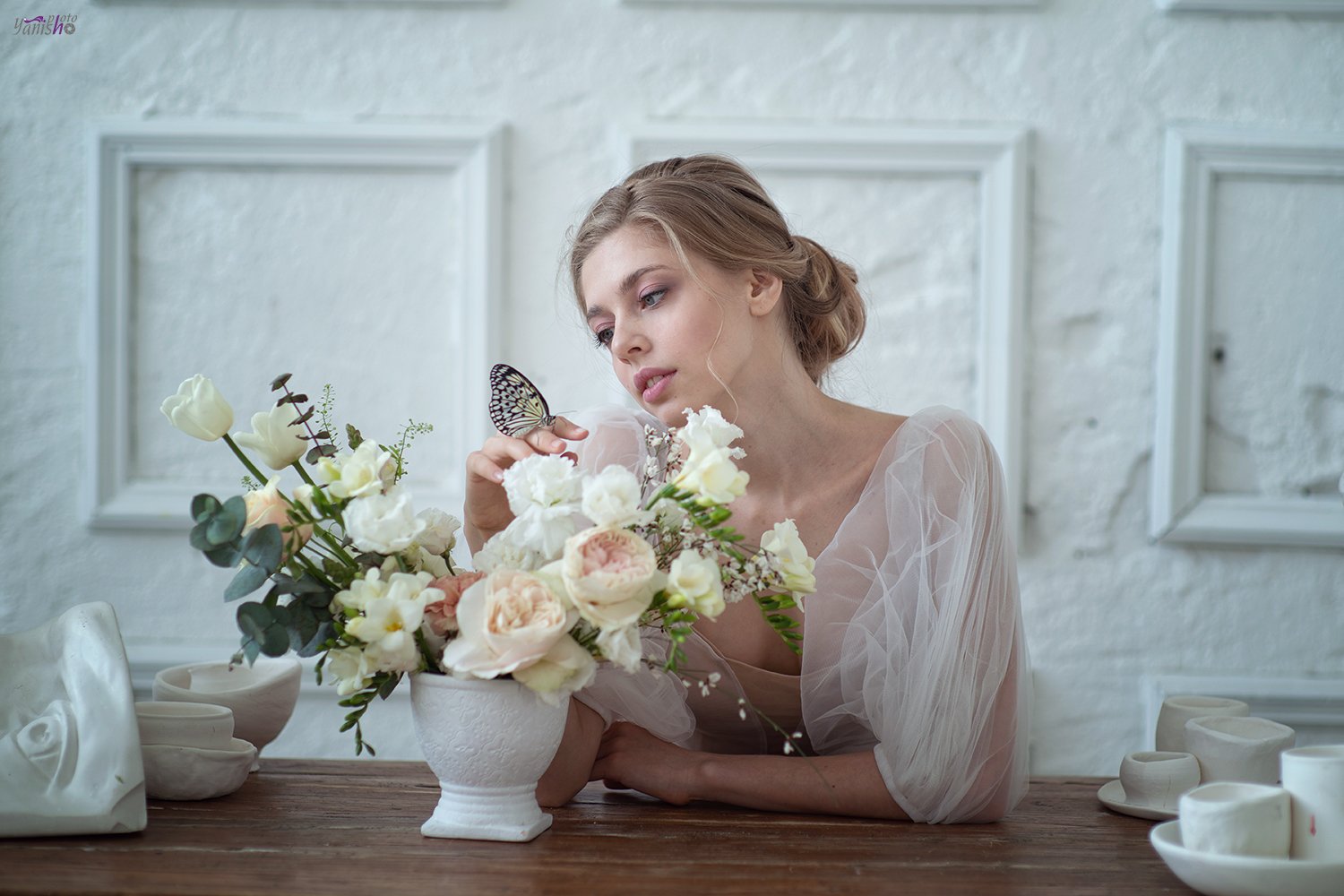 девушка, портрет, белый, студия, платье, красота, бабочки, цветы, Янина Ермакова