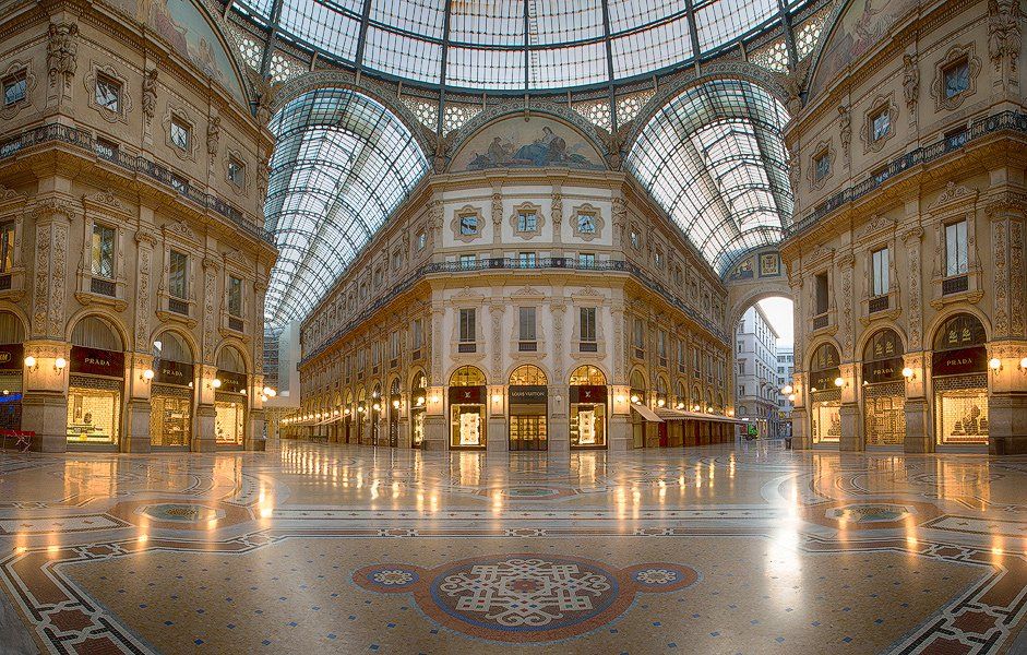 Two intersecting streets make a cruciform plan with domed octagon at center. Glass-roofed arcade with shops and cafes - an early formal covered street.