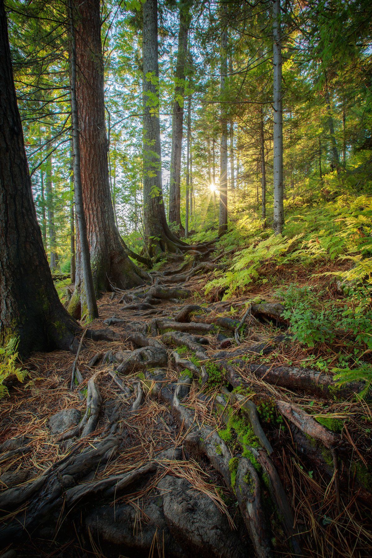 тропа, корни, деревья, солнце, осень, листья, листва, камни, мох, Евгений Трезубов