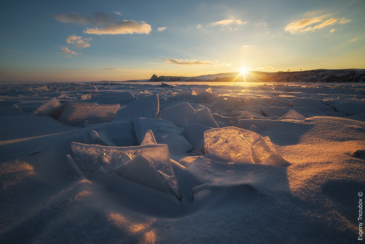 Когда десятки фотографов на рассвете снимают Шаманку мешаясь друг другу, я предпочитаю отойти чуть дальше и снять знаменитую скалу на дальнем плане, когда как на переднем найти интересные отражения и свечения солнца в россыпи льдин у побережья острова.