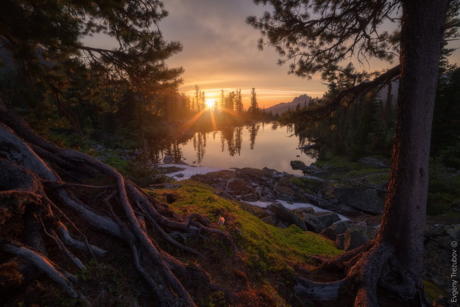 Помните я рассказывал про чудесный закат, который мы встретили на озере Лазурном в Ергаках? Вот он! Наверное моя самая удачная фотография из поездки в этот природный парк! И снята в моем любимом приеме - солнце в кадре, на переднем плане подсвечен какой-нибудь интересный предмет - в данном случае корни деревьев, плюс естественная рамка из ствола справа, веток сверху и корней снизу - все это как бы обрамляет центр композиции - солнце и озеро, в отражении которого сибирский лес и интересное закатное небо.