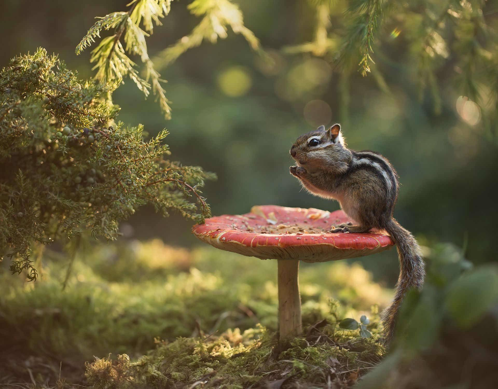 На снимке — бурундук, устроившийся на ярком грибе в солнечном лесу Якутии. Свет проникает сквозь ветви, создавая тёплую атмосферу. Животное, возможно, отдыхает перед вечером, наблюдая за закатом. Фотография передаёт спокойствие и гармонию дикой природы. Работа Евгении Левиной, известной своими снимками животных региона.