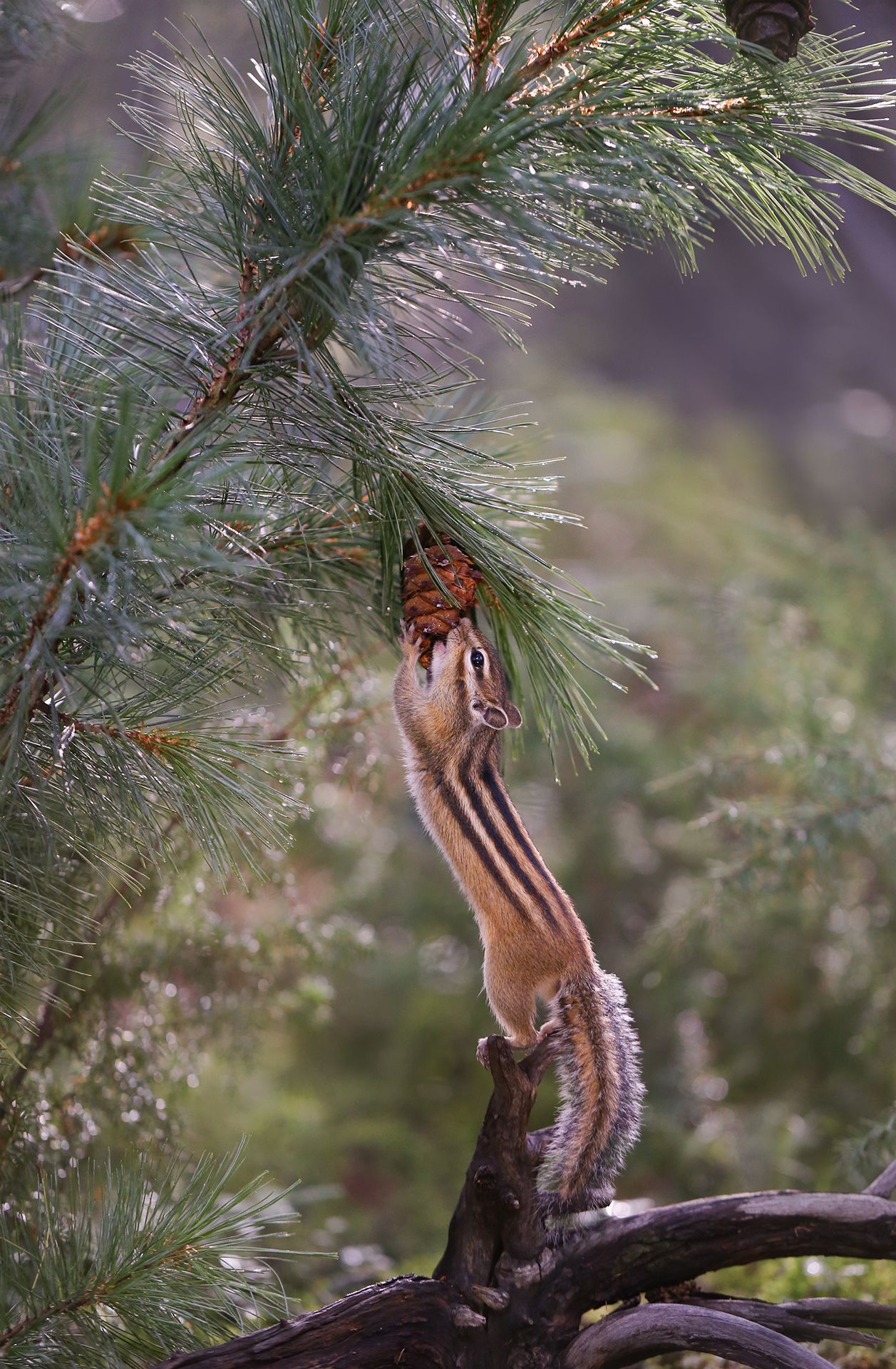 На снимке — бурундук, удерживаясь на ветке сосны, пытается добраться до шишки. Сцена запечатлена в дикой природе Якутии, где животные приспособлены к суровым условиям. Фотография передаёт естественное поведение грызуна в его среде обитания — в тайге, среди хвойных деревьев. Работа Евгении Левиной отражает красоту и динамику жизни диких животных.