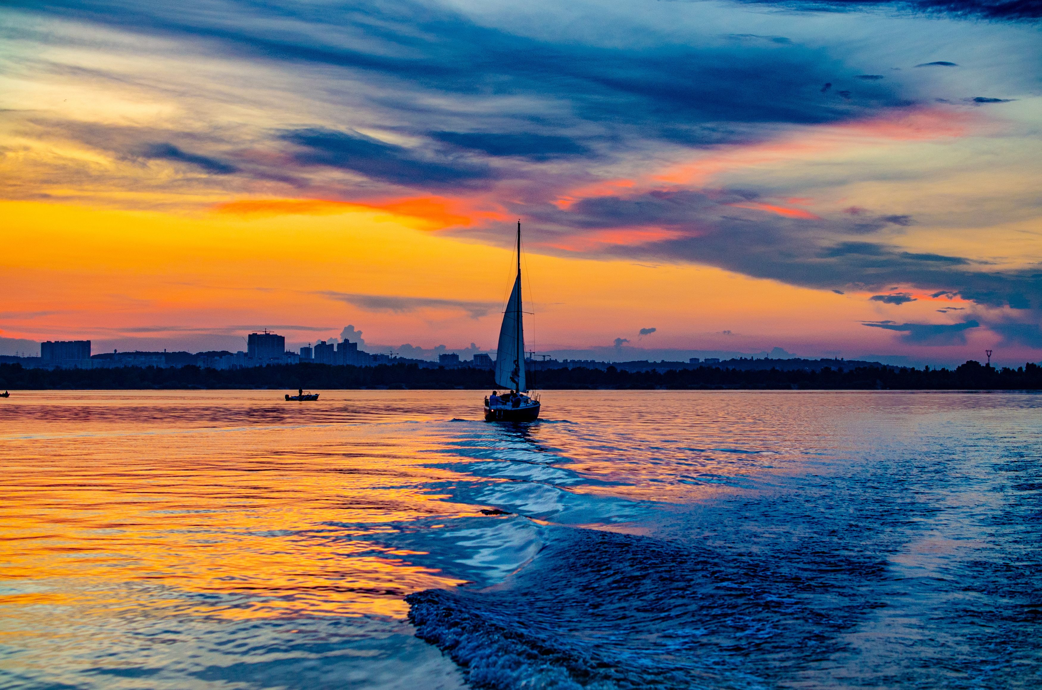 пейзаж, вода, река, закат, облака, небо, волны, яхта, парус, лодка, Евгений Каримов