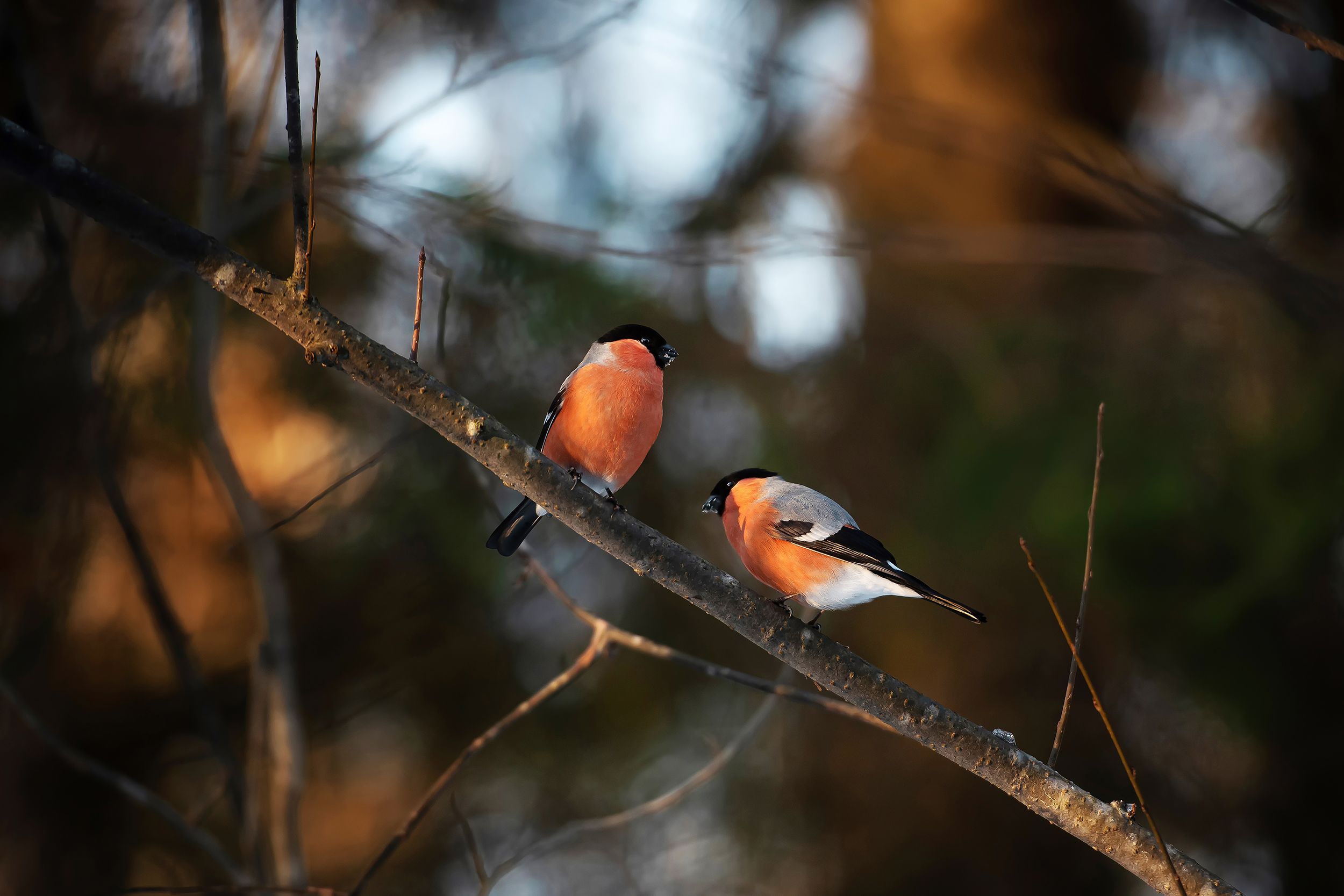 Это участок леса вдоль лыжной тропы, усеянный птичьими кормушками разных видов, среди которых есть и совсем простые, есть и мастерски выполненные. Зимой мимо проходит большое количество лыжников, которые и носят еду птицам. Семечки, кусочки сала и т.д. Именно поэтому у снегирей испачканы их клювики. Они покушали, что радует!