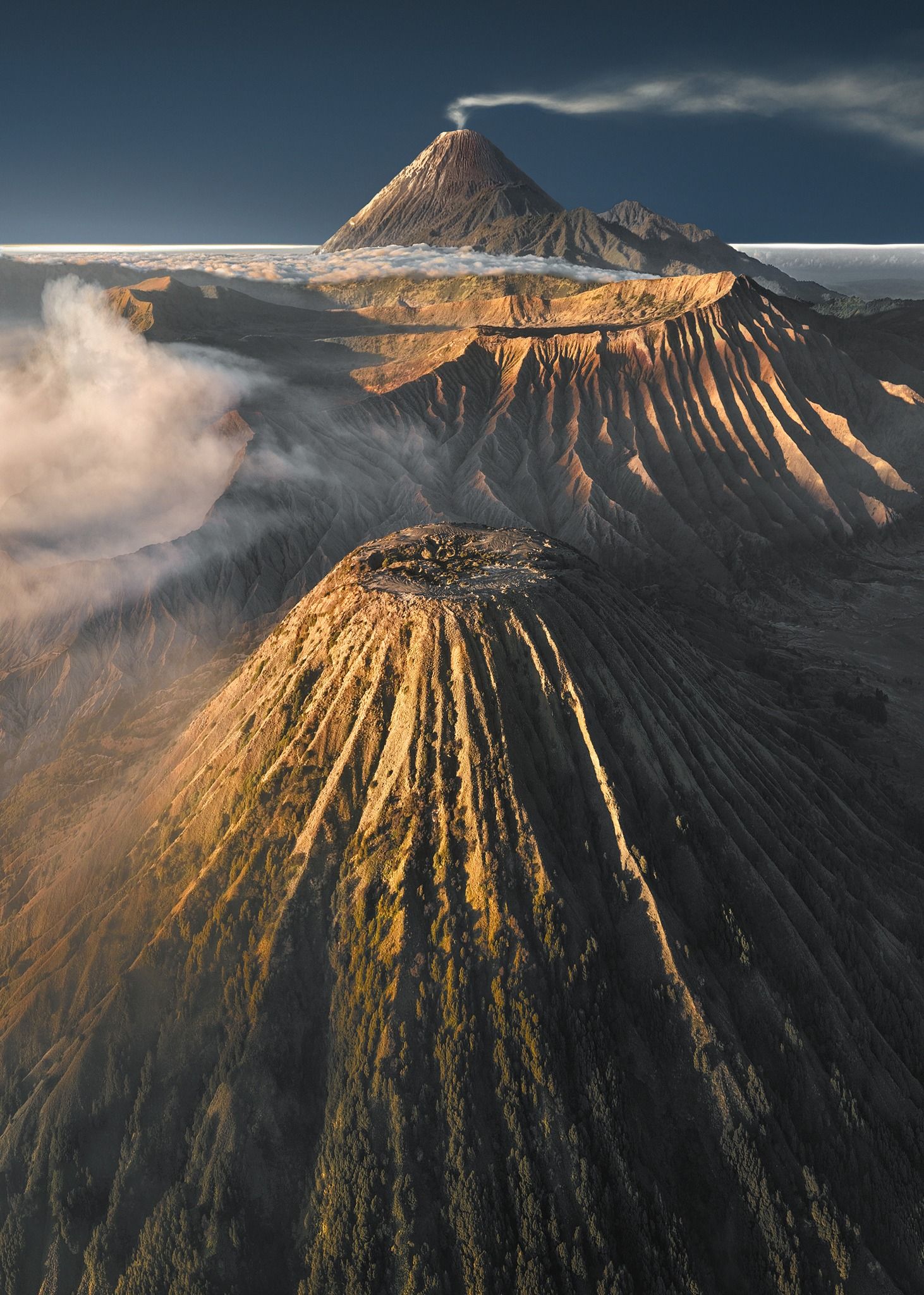 На снимке ФортунаФабрицио запечатлены вулканические конусы, возвышающиеся над облаками в часы раннего утра. Свет солнца подчёркивает рельеф склонов, создавая контраст между тенями и освещёнными участками. Несмотря на геологическую активность, сцена окутана спокойствием — как будто природа задержала дыхание. Дым над дальней вершиной — единственный признак жизни в этой величественной тишине.
