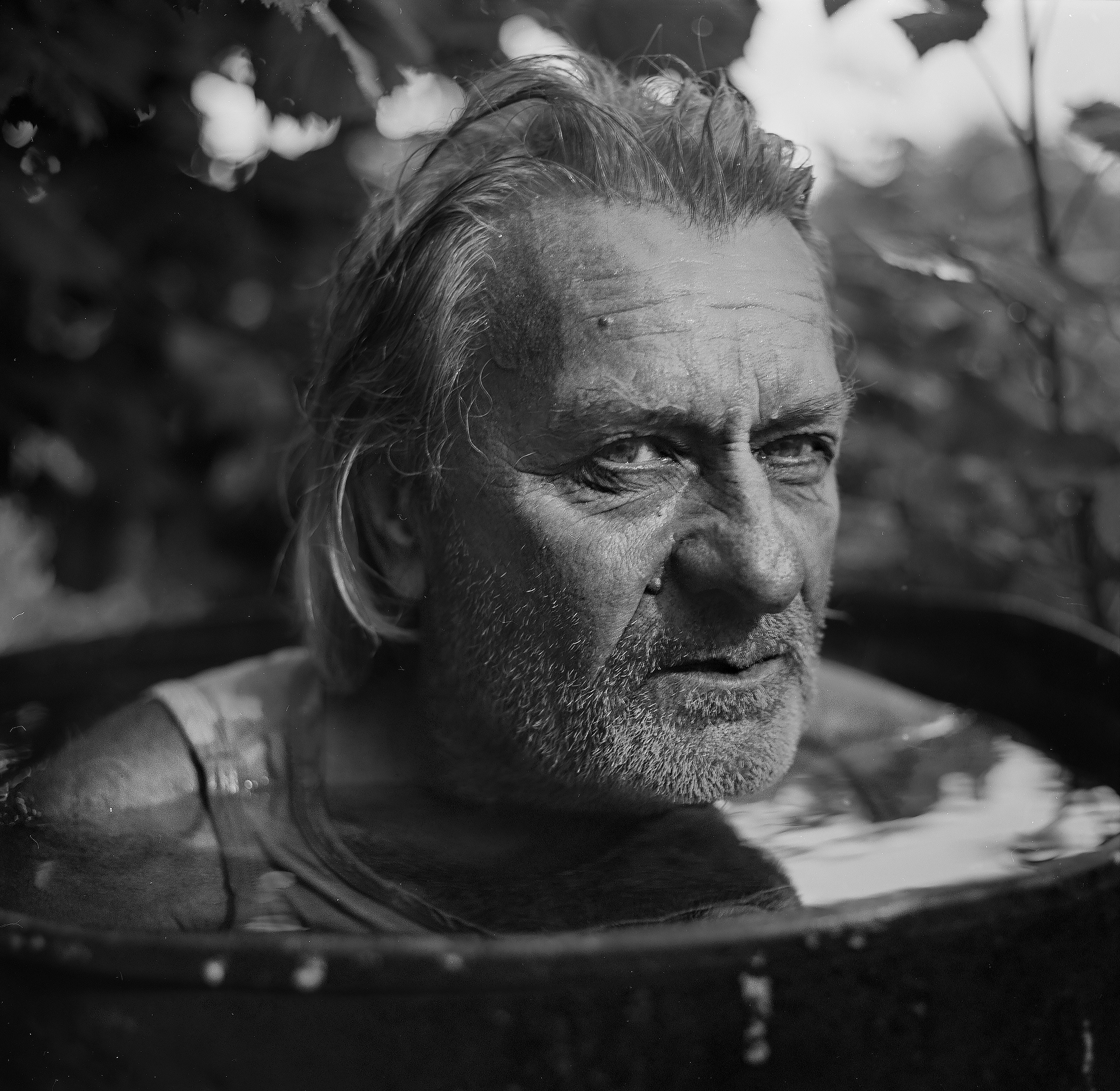 В тени листвы, в простой деревянной ванне, погружённый в воду по плечи, мужчина смотрит вдаль — его лицо, выгравированное временем, отражает усталость и мудрость. Фотография Артёма Федосенко захватывает не просто сцену, а внутреннее состояние: тишину, размышление, уединение. Чёрно-белая палитра усиливает драматизм, акцентируя текстуру кожи, морщин и капель воды. Это не просто купание — это пауза в жизни, момент, когда человек возвращается к себе. Взгляд, направленный в сторону, словно говорит: «Я здесь, и я помню».