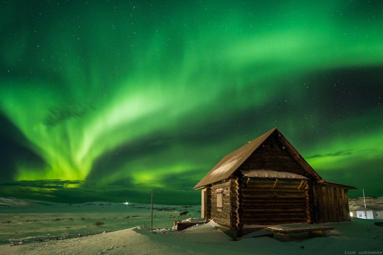 северное сияние,ночь,териберка,север,зима,небо,пейзаж,крайний север,дом,панорама, Горшков Игорь