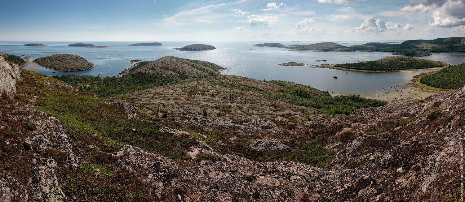 Панорама островов архипелага Кузова с вершины Русского Кузова.
