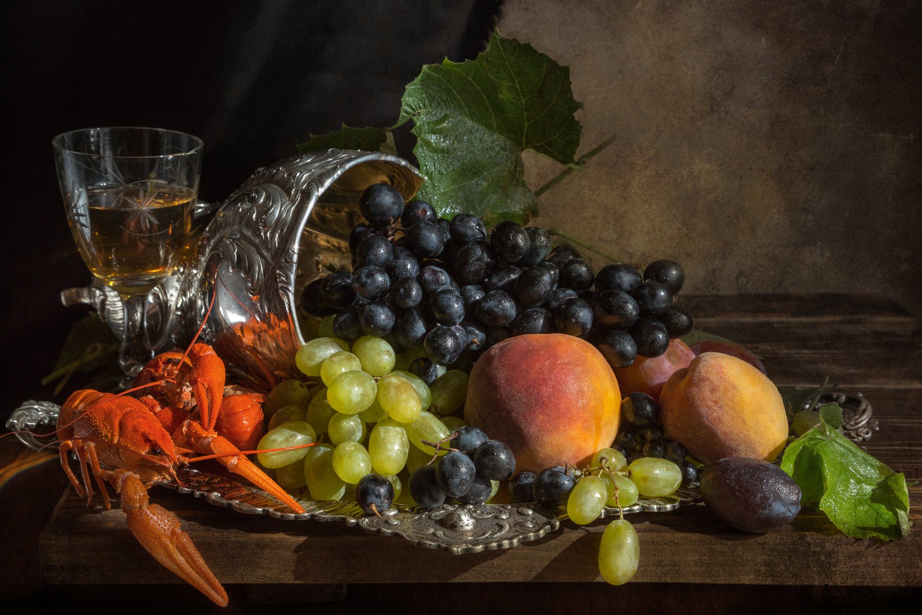 фото , цвет , натюрморт ,  фрукты , персик , виноград  , поднос , раки , ваза , серебро, Федотов Вадим(Vadius)