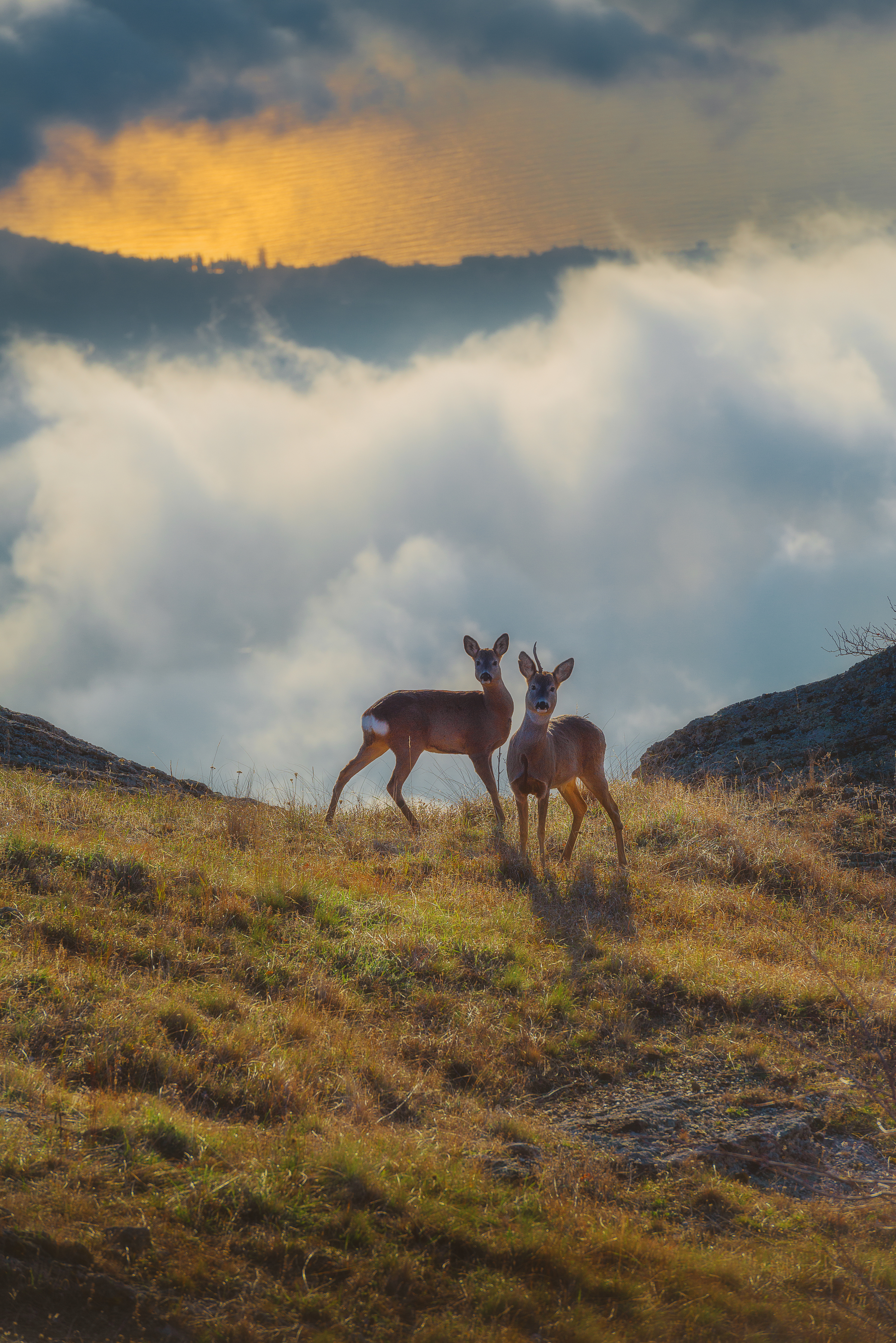 Вы передали динамику момента: косули на фоне облаков и золотого света — сильный контраст, живое напряжение. Склон и освещение подчёркивают высоту, взгляд животных — прямой контакт с зрителем.