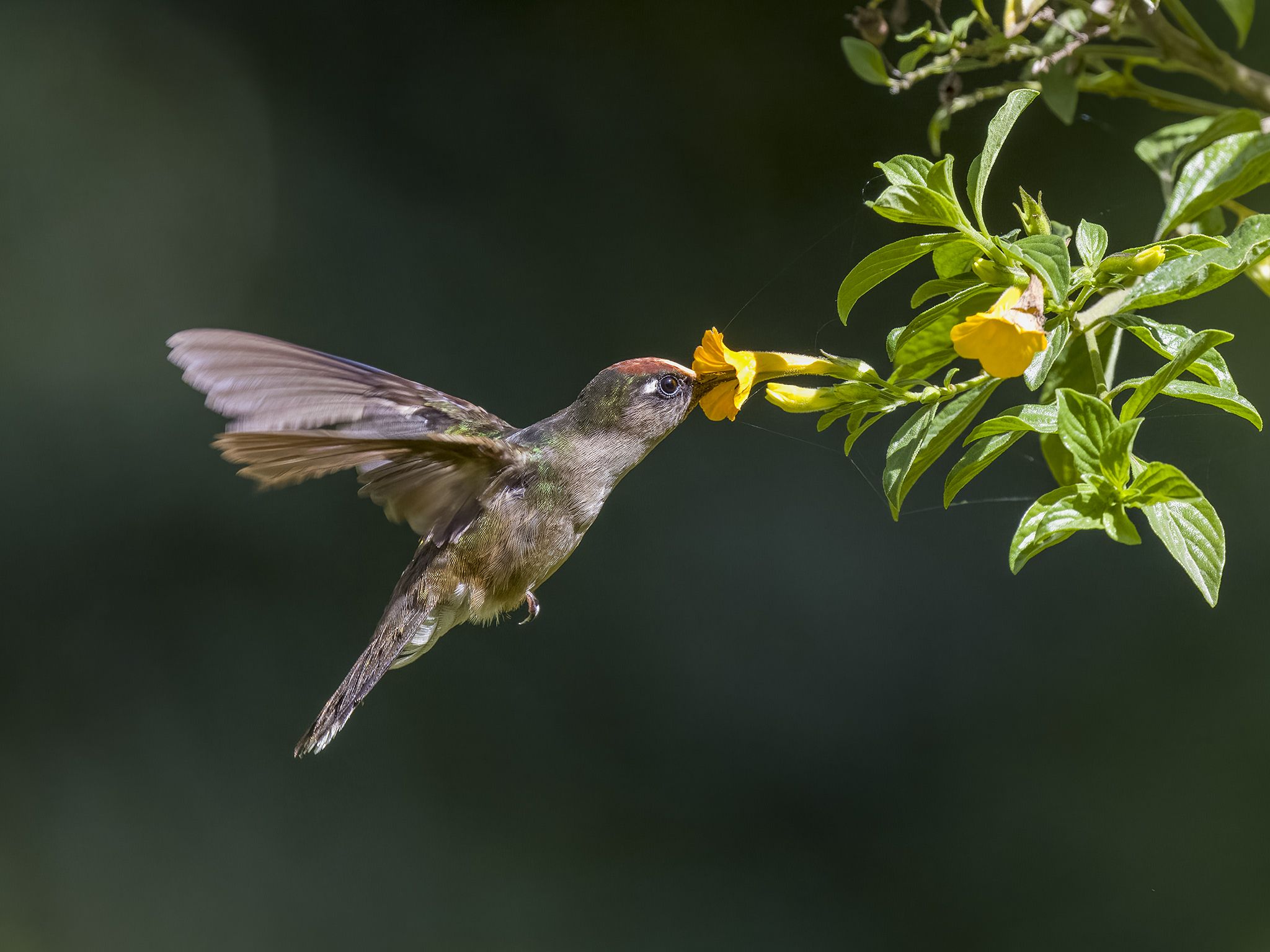 Colibrí pequeño, restringido principalmente a los Andes centrales de Colombia, aunque llega también a los Andes orientales al sur del país. Ambos sexos tienen una llamativa mancha postocular blanca y puntas pálidas en las plumas de la cola. El macho tiene la corona castaña, la cual se vuelve blanca hacia la frente. Habita en el bosque nublado en donde se alimenta de flores pequeñas cerca del suelo. A veces al posarse emite una serie de suaves “chip”.