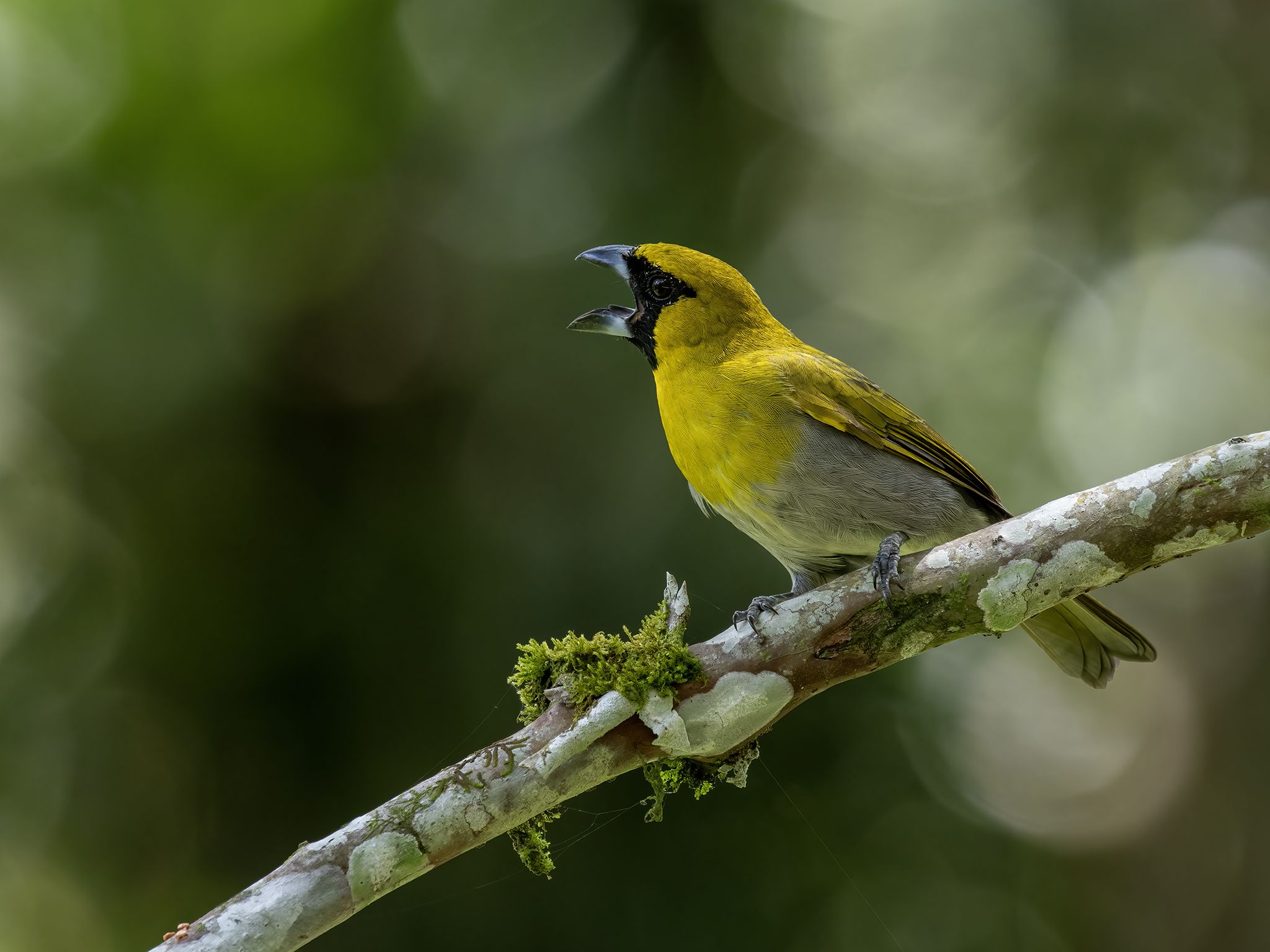 Pájaro bastante rechoncho y social que habita en bosques húmedos siempreverdes y bordes en tierras bajas tropicales y estribaciones. Usualmente en grupos pequeños y frecuentemente ruidosos (a veces hasta de 50 pájaros), moviéndose en los niveles medios a superiores en árboles frutales. Usualmente, no se une a bandadas de especies mixtas de forrajeo. Ambos sexos son iguales, con un plumaje sutilmente atractivo: cabeza y pecho amarillo-mostaza con cara negra y vientre azul-gris. Las llamadas son silbidos emotivos.