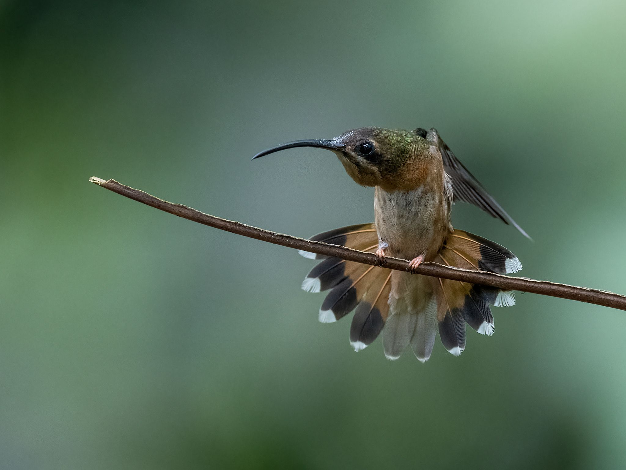Colibrí mediano con un pico largo y curvado, con rayas blancas y negro en la cara. Totalmente castaño por debajo. Busca el patrón de la cola: con puntas blancas en toda la cola y con la base castaño en las plumas externas. No tiene las plumas centrales de cola alargadas como algunos ermitaños. Se mueve rápido, usualmente sólo se ve durante unos segundos en un parche de flores. Prefiere bosques y bordes.