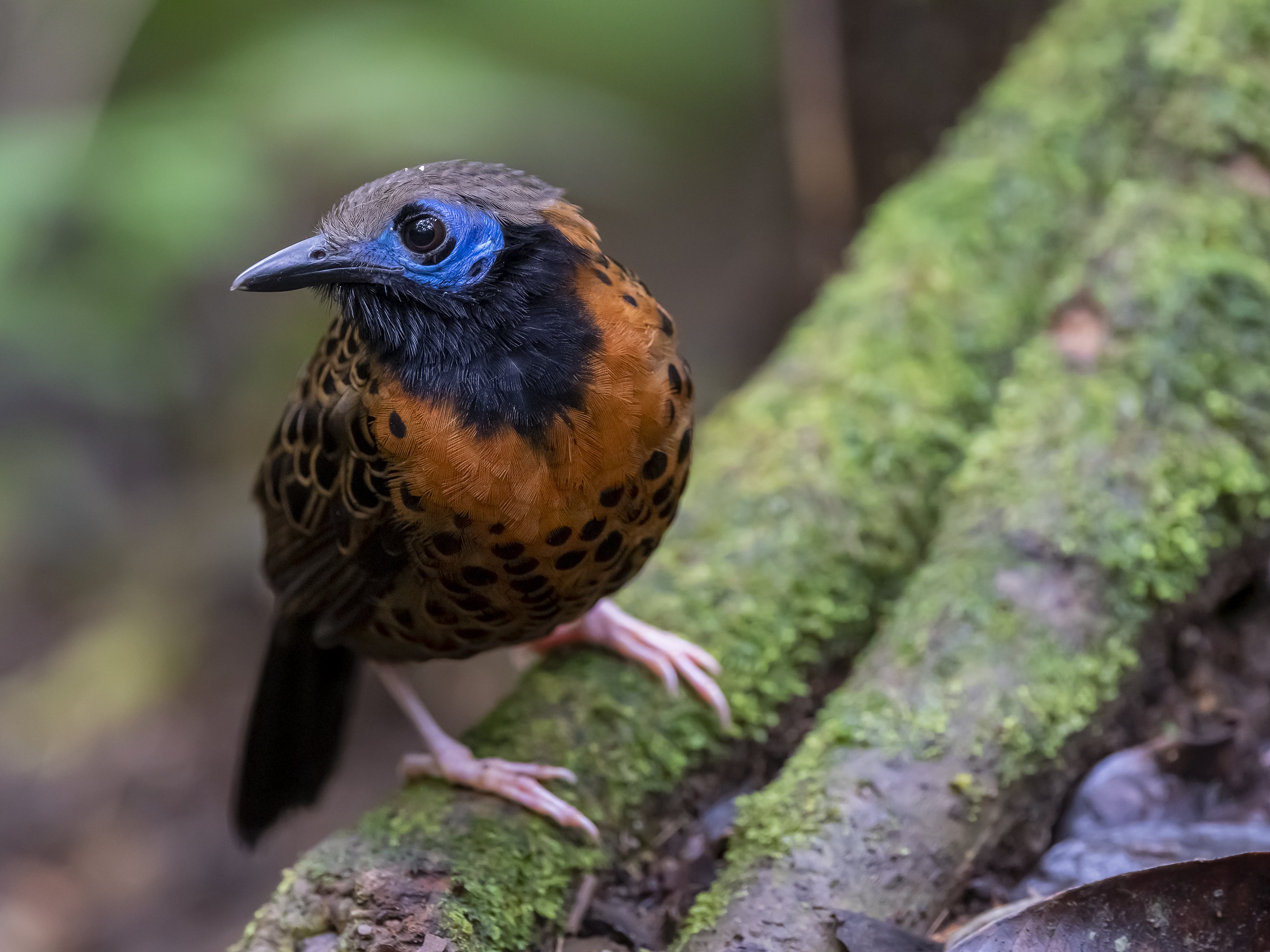 Espectacular, fornido habitante de bosques; usualmente poco común. La piel azul-eléctrico del rostro, el cuerpo ferruginoso, la garganta negra y el patrón festoneado pálido hacen que sea poco probable confundir este hormiguero con cualquier otra especie. Más grande que otros hormigueros en su rango. Puede ser difícil de ver bien; encontrado cerca del suelo en bosques maduros, generalmente en pares o pequeñas bandadas siguiendo un ejército de hormigas guerreras. Escucha por su llamada regañona descendente. Sexos parecidos.
