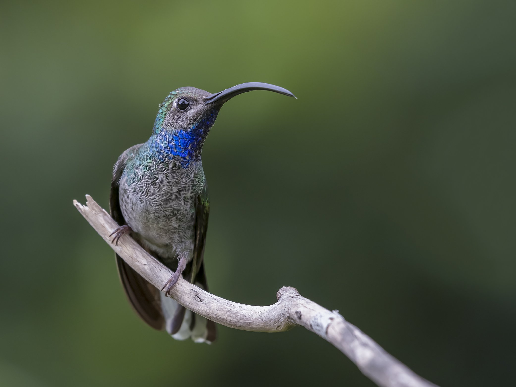 Colibrí grande, agresivo y espectacular de bosques perennifolios húmedos en montañas y laderas, migrando estacional y localmente hacia tierras bajas en el sureste de México. Se alimenta de flores en todos los niveles y a veces en el dosel en árboles a lado de caminos. Note el tamaño grande pico grueso y arqueado, y parches blancos grandes y resplandecientes en las puntas de la cola. El sorprendente plumaje púrpura del macho suele verse negruzco, pero cuando logra reflejar la luz… ¡wow!